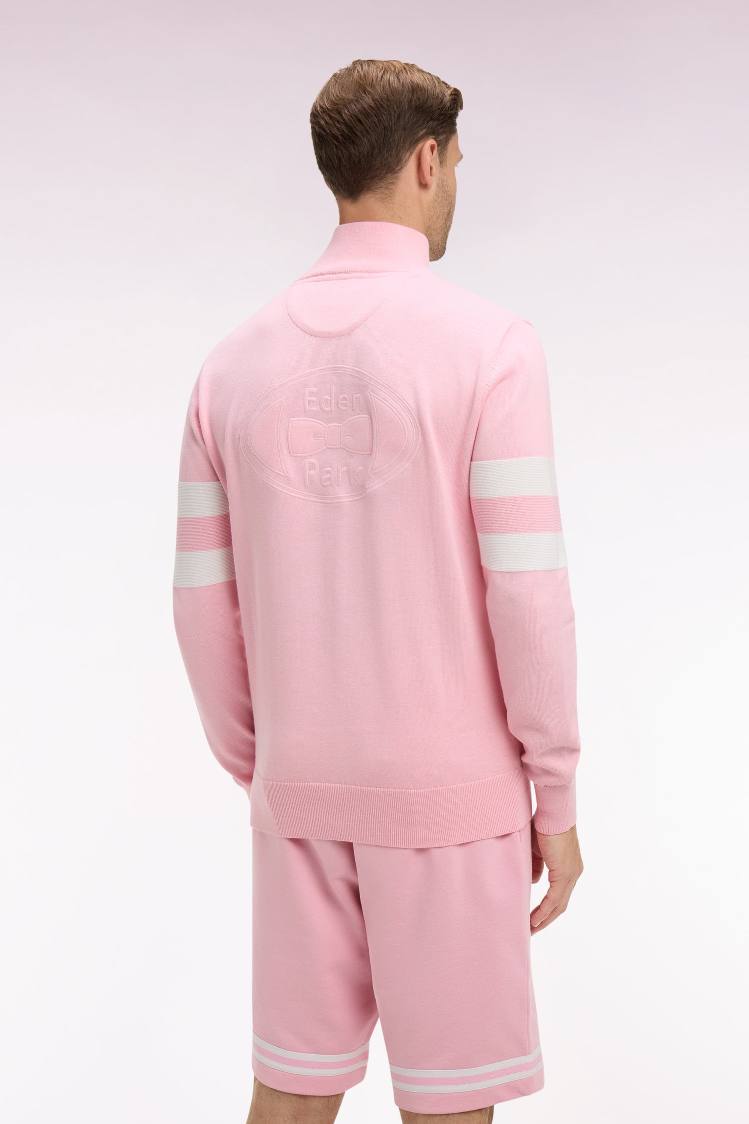 Ce pull masculin à col camionneur incarne l’esprit sport chic emblématique des collections mode de la Maison. Réalisé en tricotage jersey, ce modèle se distingue par ses rayures contrastées en point ottoman sur les manches. Son zip au col et ses finitions bords-côtes soulignent une allure contemporaine soignée. Décliné en ciel, rose ou marine, ce pull homme est un clin d’œil élégant à notre héritage rugby. Inspiré des maillots de l'ovalie il en propose une version soignée et contemporaine pensée pour une silhouette plus urbaine.
