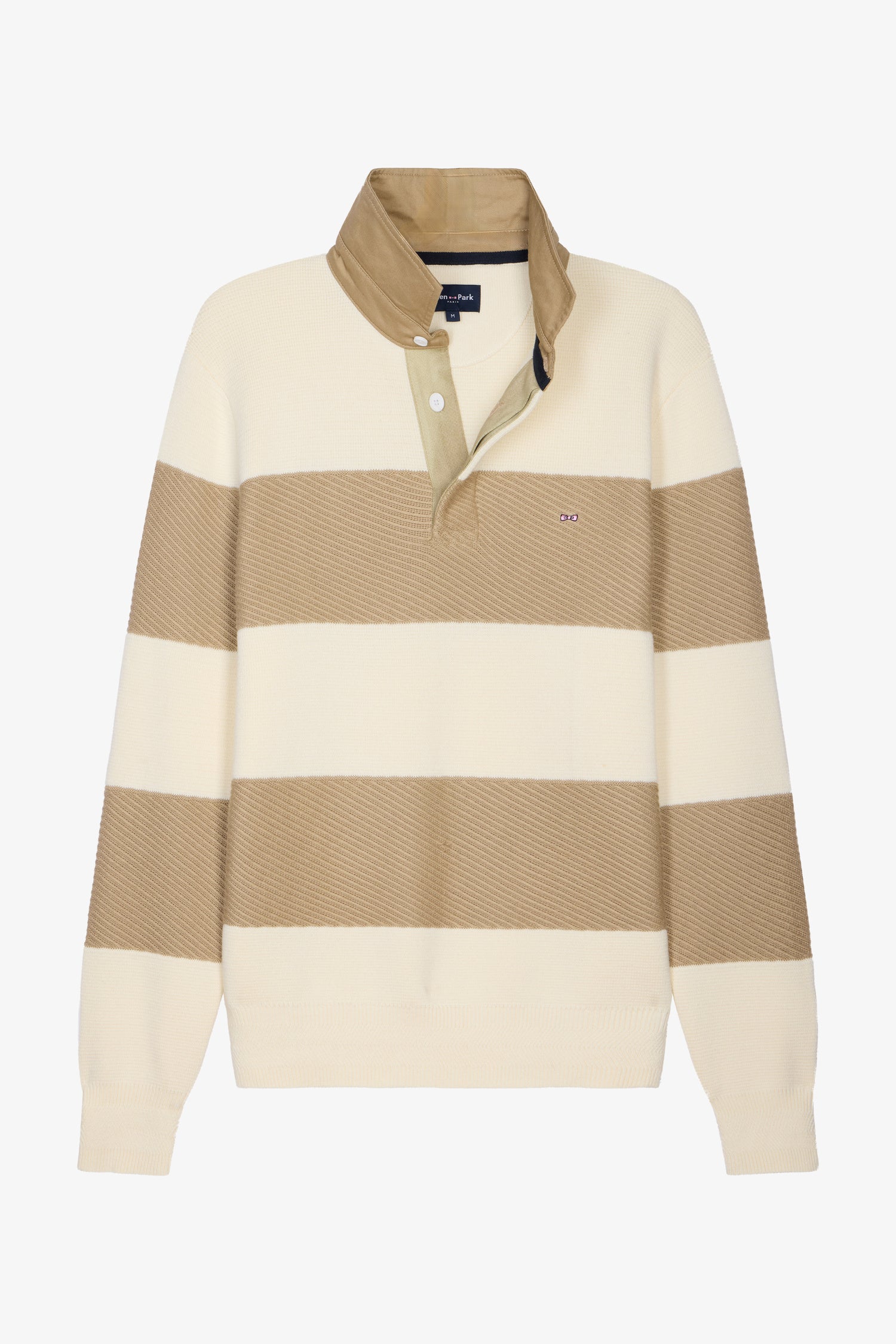 Ce pull en coton pur séduit par son jeu de rayures beige et écru, à la fois chic et lumineux. Son col maillot en twill, rehaussé d’un pied de col raffiné et d’une finition intérieure en ruban tricoté, affirme une allure soignée. Le tricotage Milano et le point twill apportent structure et tenue à ce pull masculin, tandis que la plaquette boutonnée en ruban chevron et les bords en bords-côtes chevron signent une pièce élégante en toute saison. Le soin porté aux finitions de ce pull en font un pilier durable du vestiaire masculin moderne.