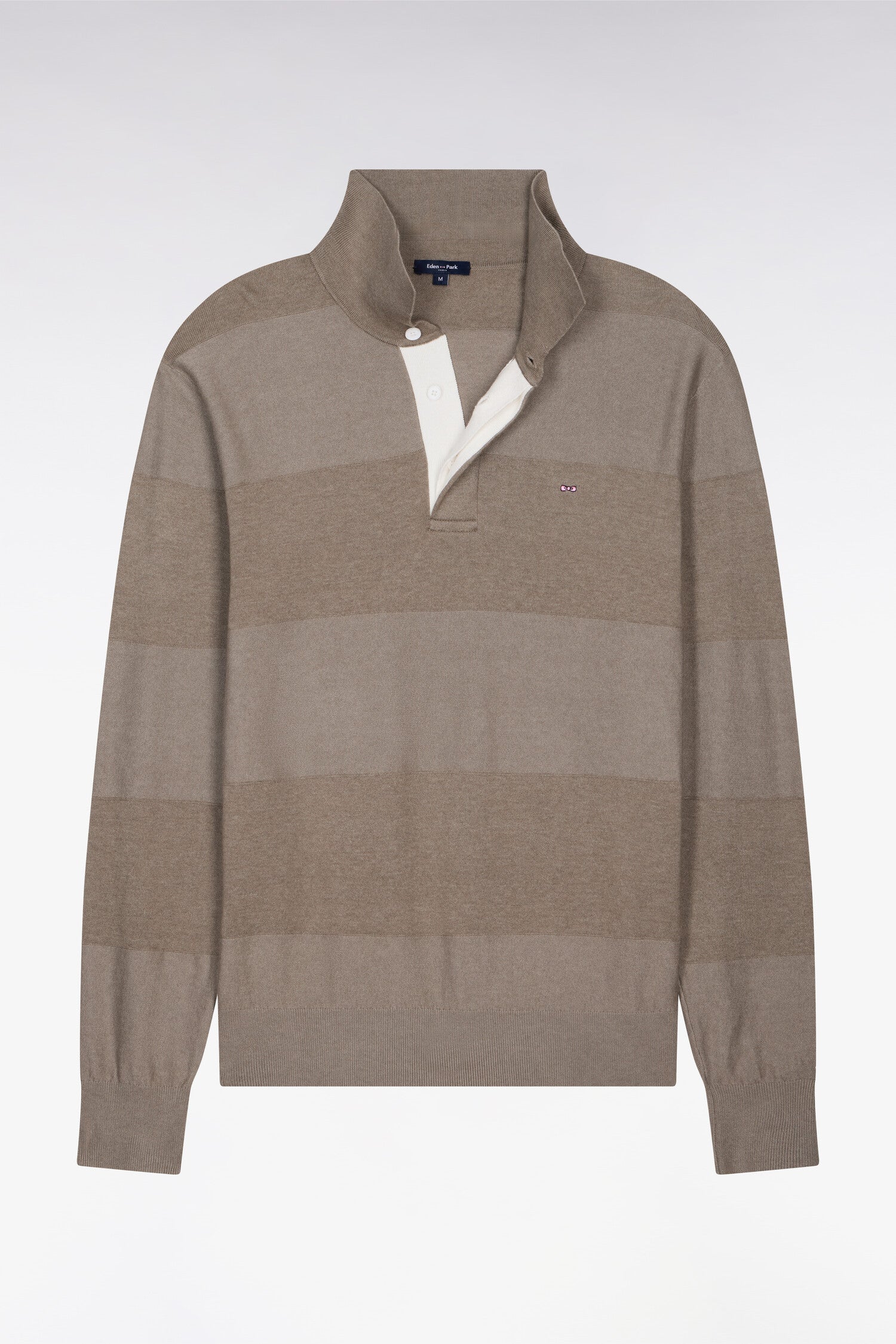 Dans son association de rayures beige et kaki inspirées des maillots de rugby belges, ce pull col maillot déclare avec élégance notre héritage rugby. Le passage d'un point jersey au point jersey envers se fait subtilement via des surpiqûres de liaison créant ces élégantes rayures à même la matière. Sa plaquette de boutonnage est réalisée en ruban chevron blanc pour plus d'élégance.