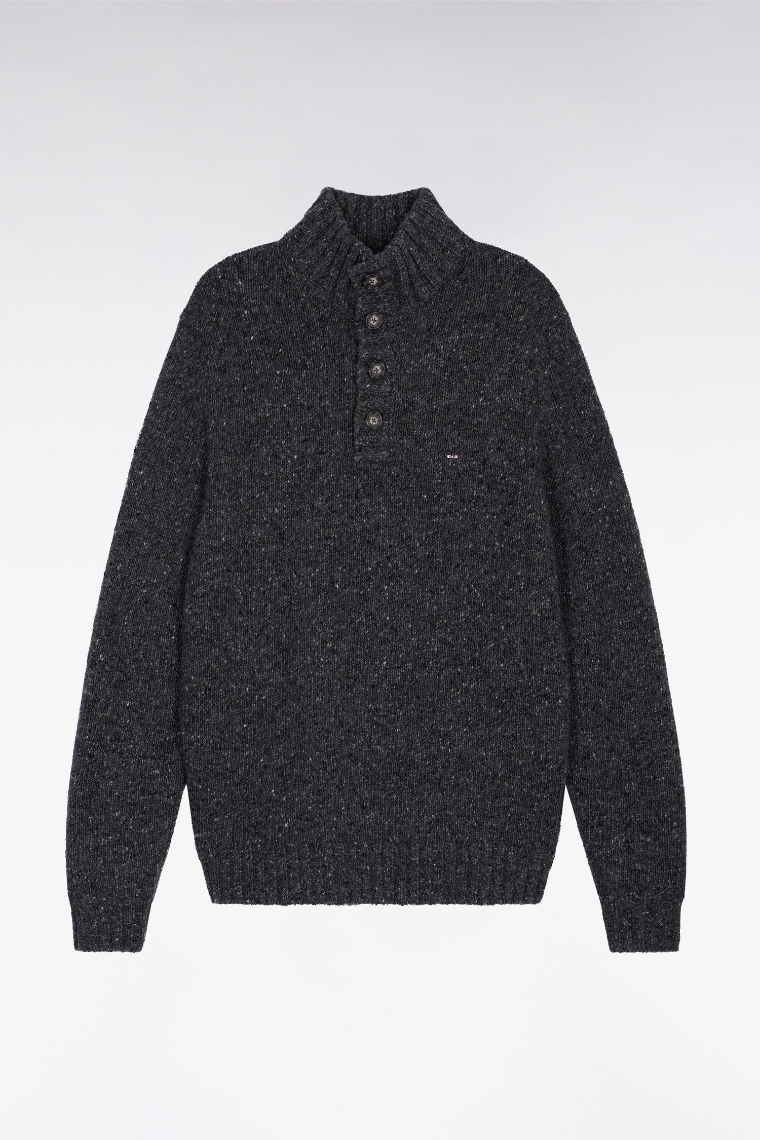 A true ally for chilly days, this stand-up collar sweater features a thick knit, knitted from a blend of alpaca and virgin wool for a rich, authentic texture. This thick sweater combines warmth, softness and elegance. Featuring a four-button closure, ribbed collar and ribbed trims, it attests to the care we take in every detail, as well as in our selection of materials. The pink bow tie embroidered on the chest discreetly marks this timeless piece, available in beige or gray.