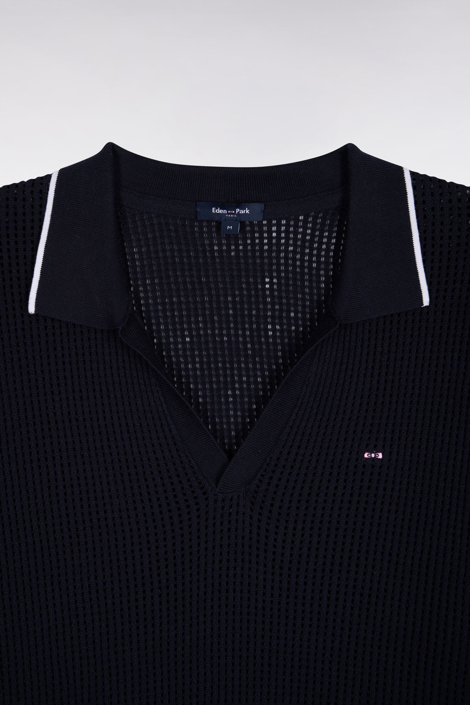 Notre pull col polo à manches longues, proposé en marine ou en blanc, se distingue par sa maille mesh légère qui apporte fraîcheur, relief et modernité. Son caractère est rehaussé par un liseré contrasté au col et aux poignets, ainsi que par le nœud papillon brodé sur la poitrine, emblème de notre Maison. À porter avec un jean clair, un pantalon large ou un short d’été pour une silhouette élégante et effortless quoi que vous réserve le moment.