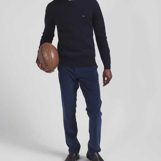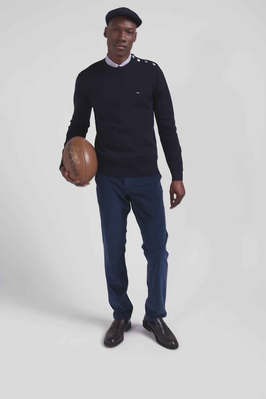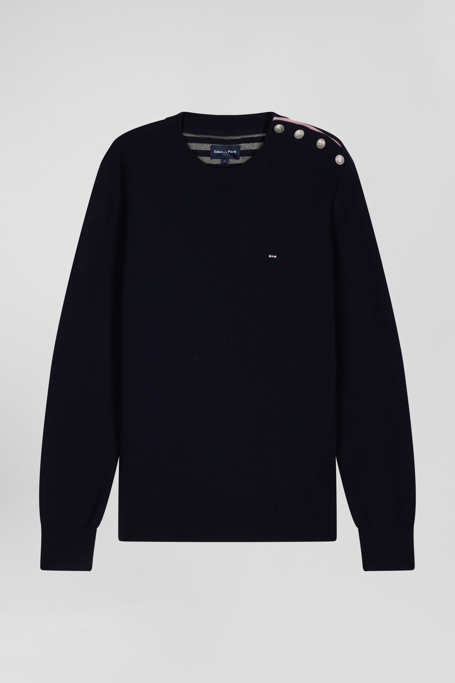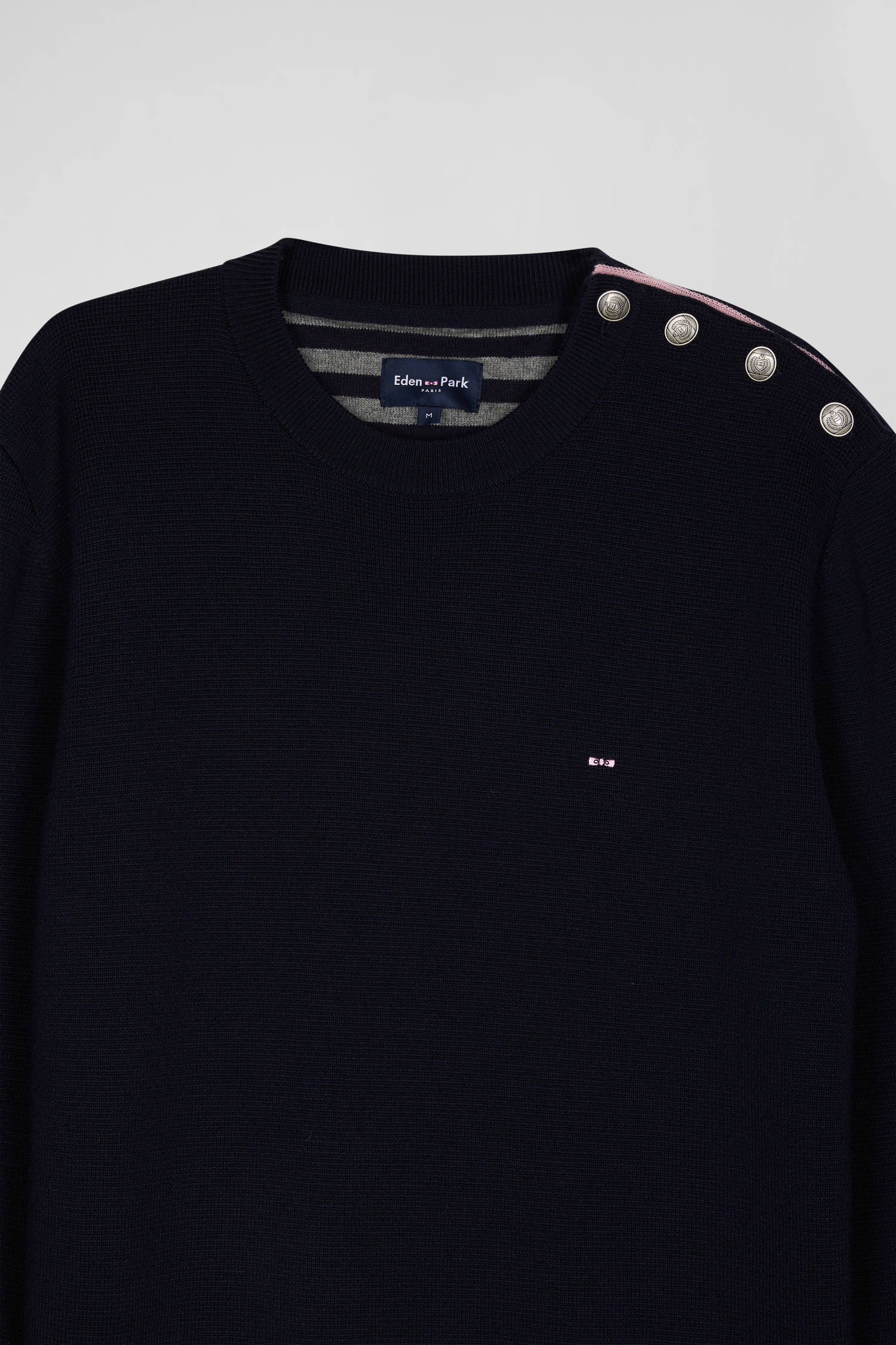 Crafted in soft, comfortable wool, this navy blue men's sweater features a round collar with a button placket and gold buttons on the shoulder. Timeless and versatile, this navy wool sweater features our signature pink bow-tie embroidery on the chest.