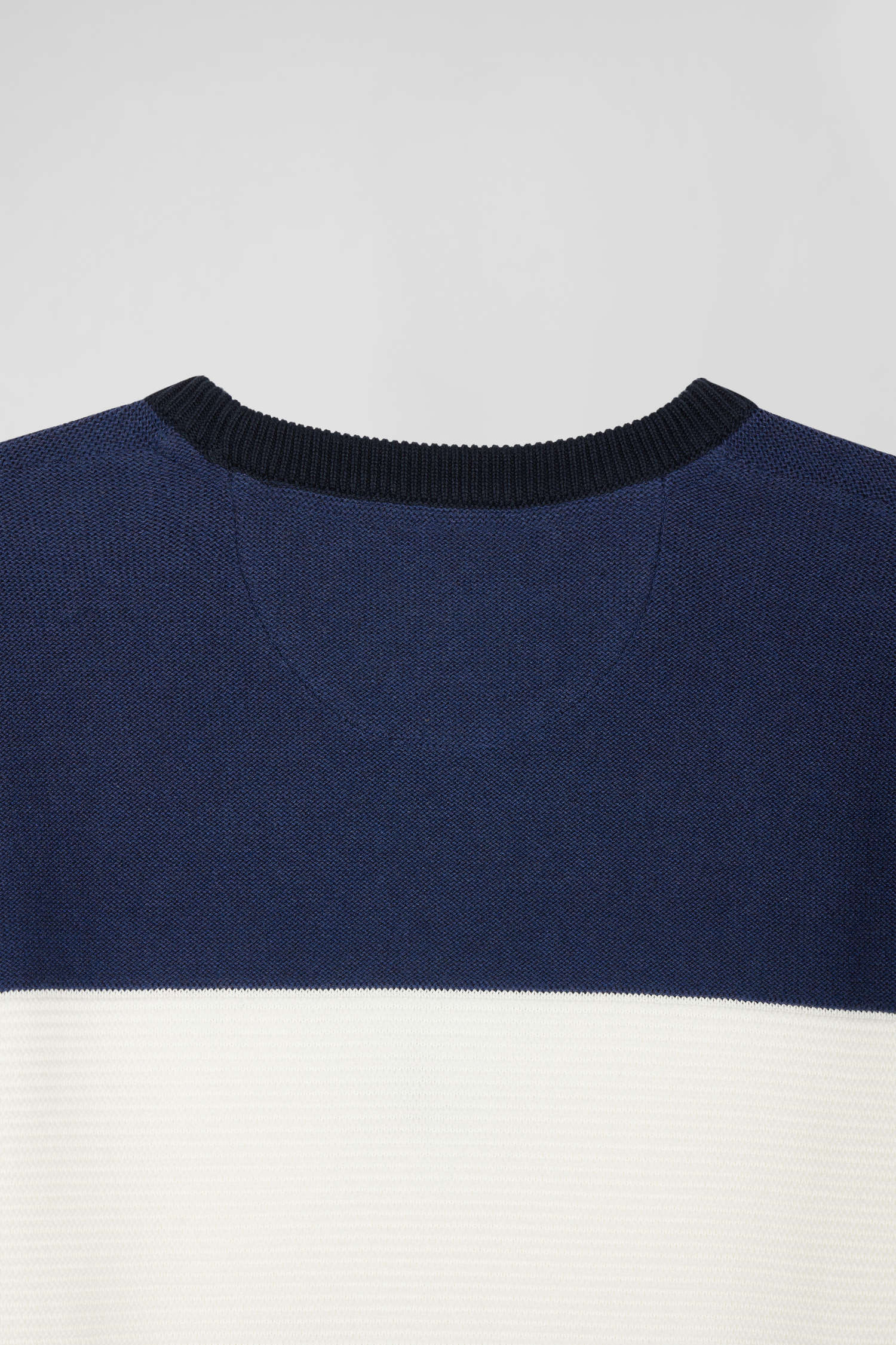 With its contrasting stitch effects achieved through alternating knits, this men's round-neck sweater adds a graphic touch to the silhouette. The cut and sewn assembly inspired by our jerseys lends a trompe-l'oeil effect to this deceptively classic tricolored sweater.