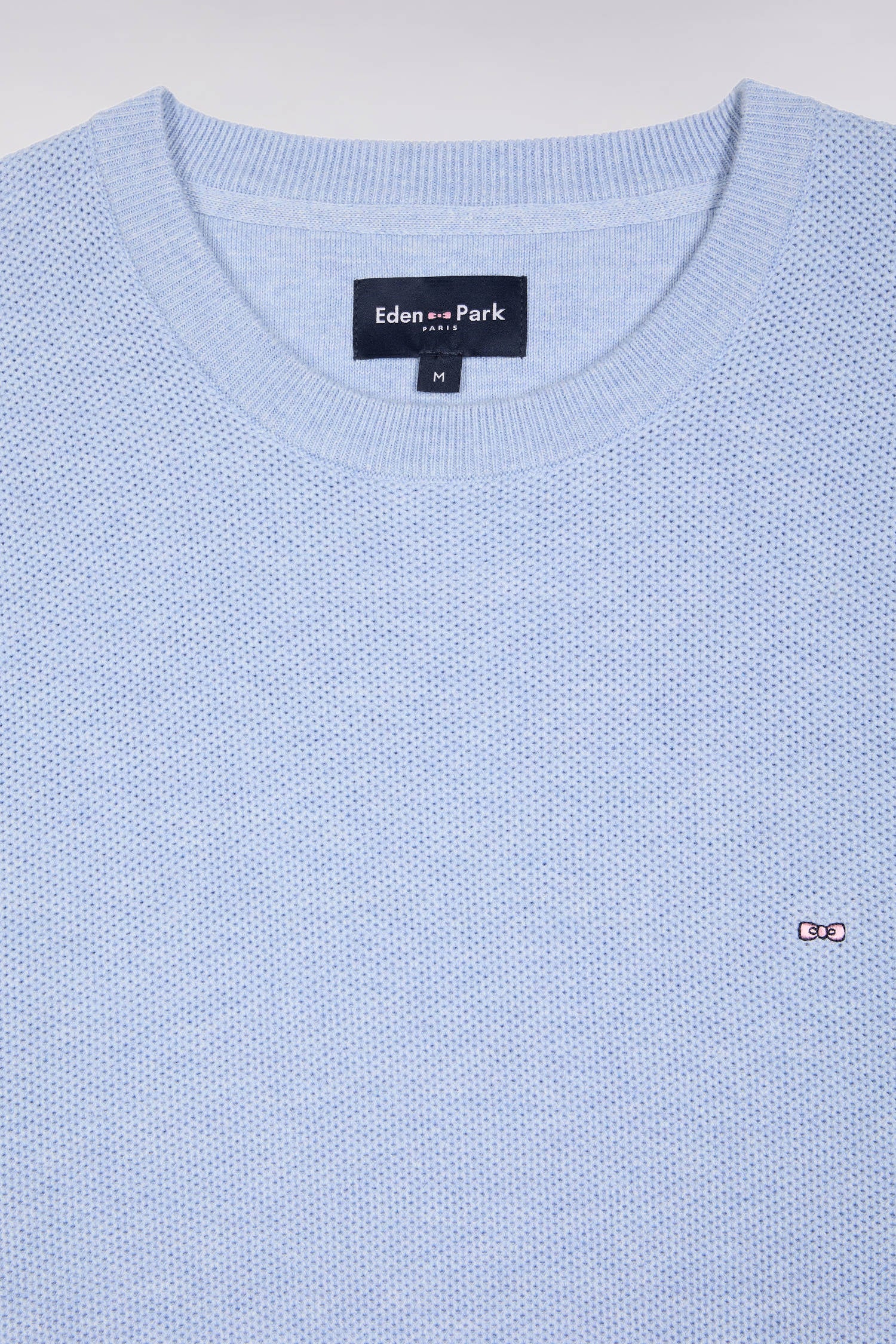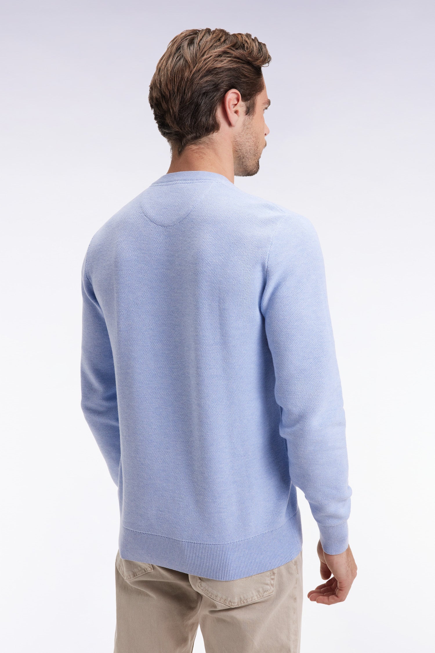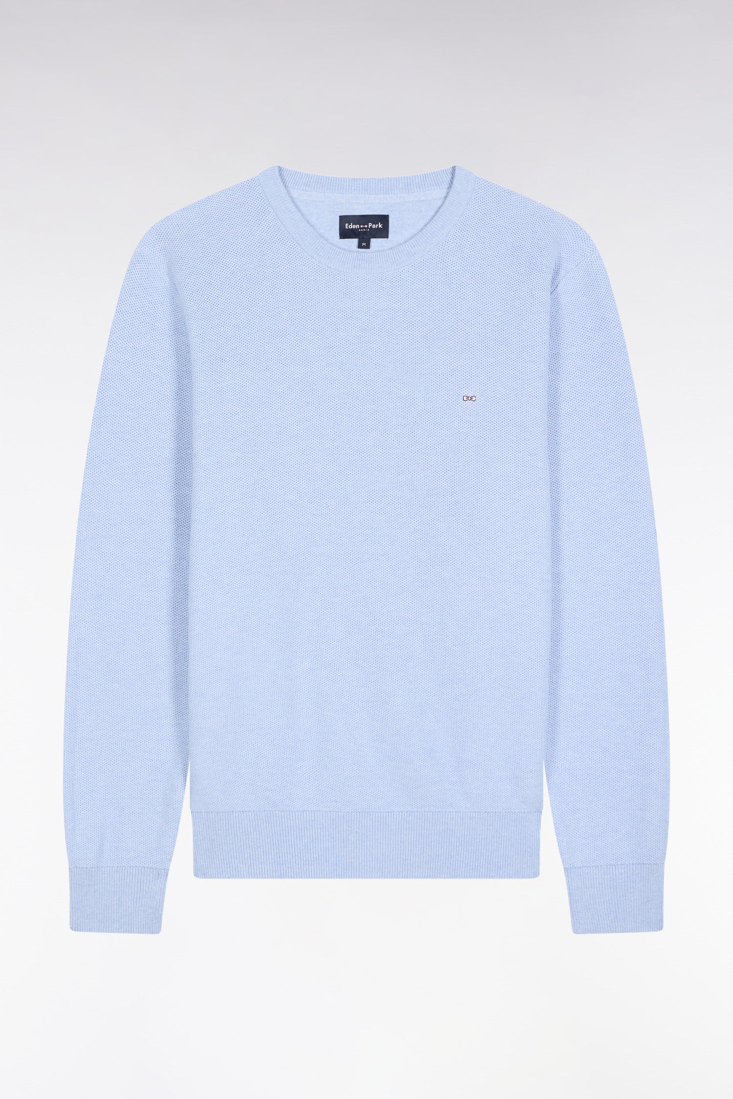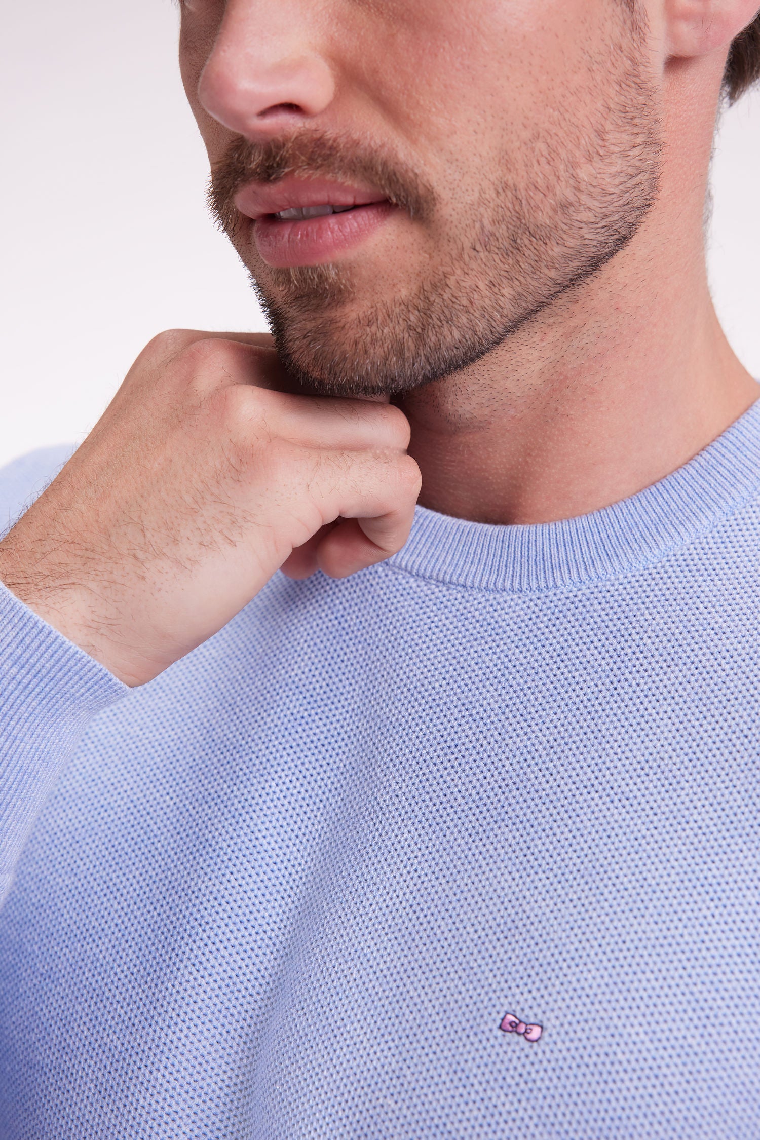 A slightly irregular texture and a chic-casual spirit perfectly describe this round-neck sweater in honeycomb cotton. Its straight cut and bow-tie embroidery on the chest give it a neat look without overdoing it, true to Eden Park DNA. The ribbed collar and sleeve cuffs contrast neatly with the slightly more whimsical honeycomb knit. An easy-going piece, ideal for seasonal layering. This masculine round-neck sweater is part of a complete wardrobe comprising several knitwear pieces with the same characteristics to suit all styles and morphologies