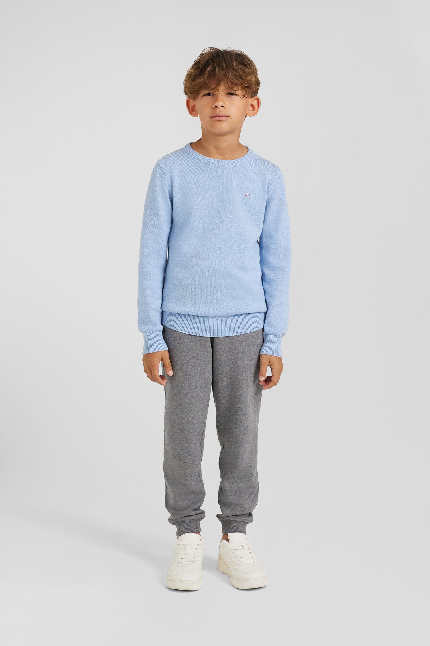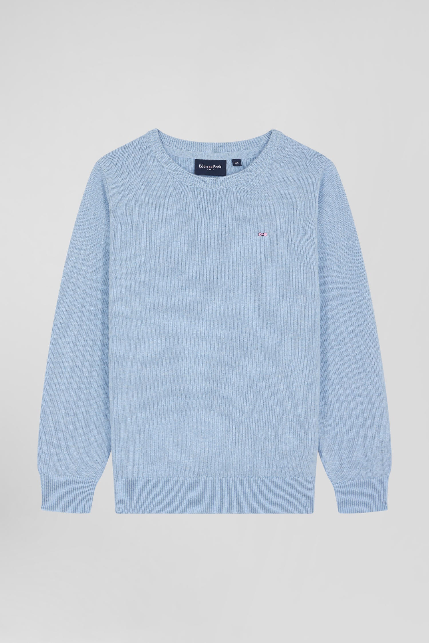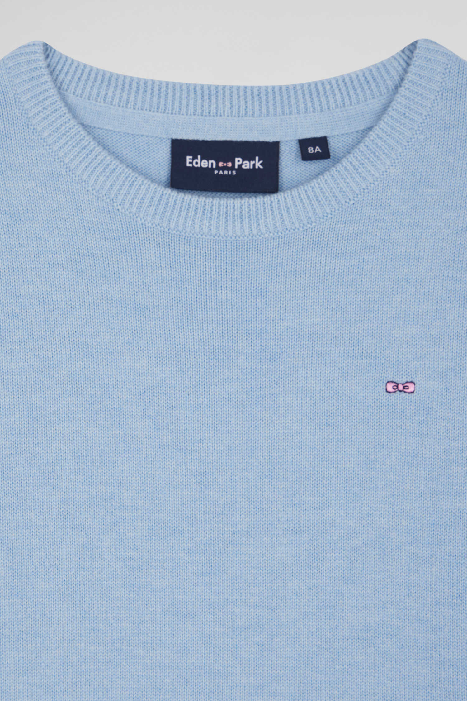 Perfect for seasonal transitions, our children's cotton and wool round-neck sweater is lightweight yet warm. In its soft sky color, it's as practical as it is cute, ideal for layering over a T-shirt or wearing next to the skin on its own.