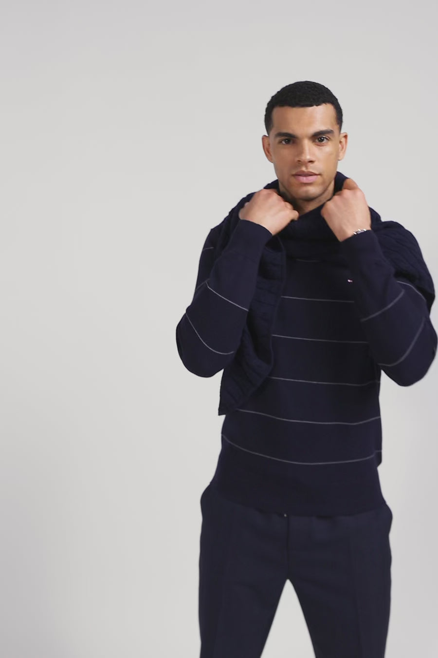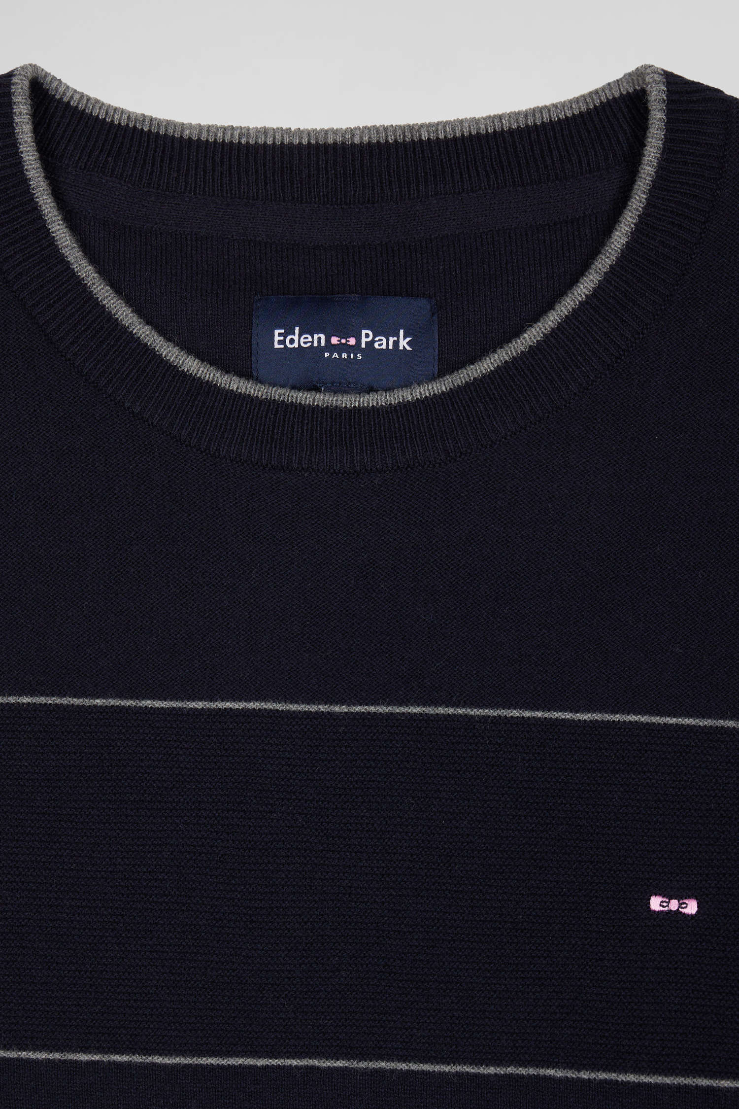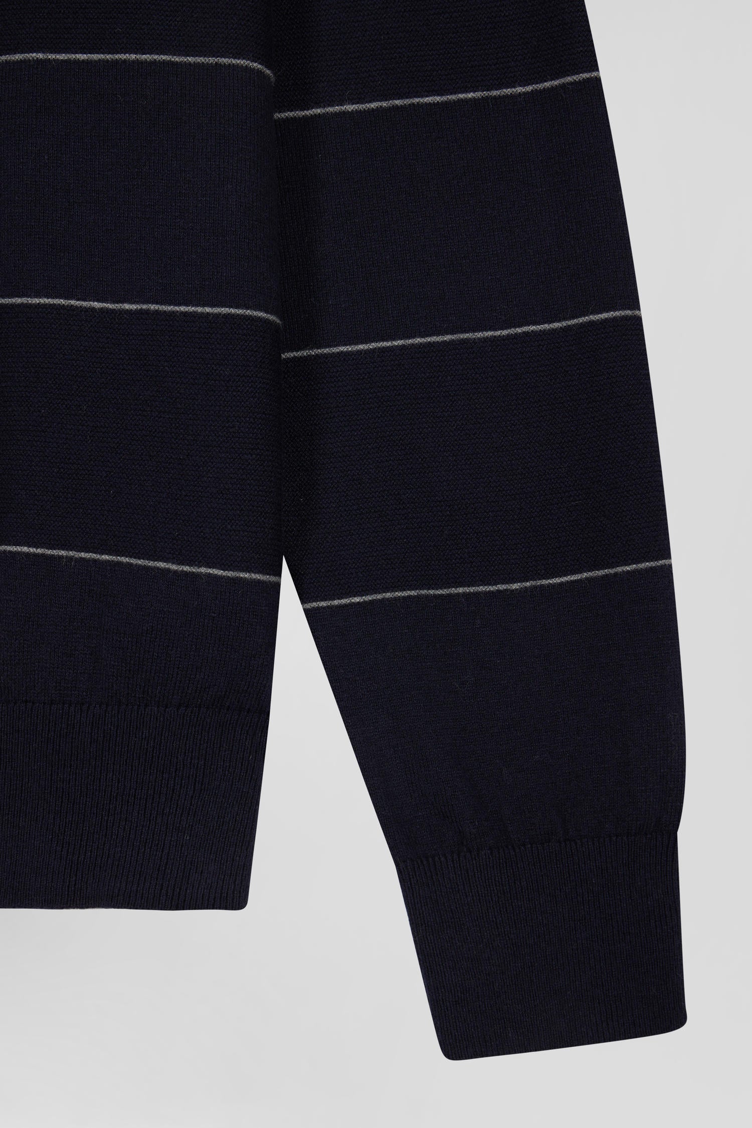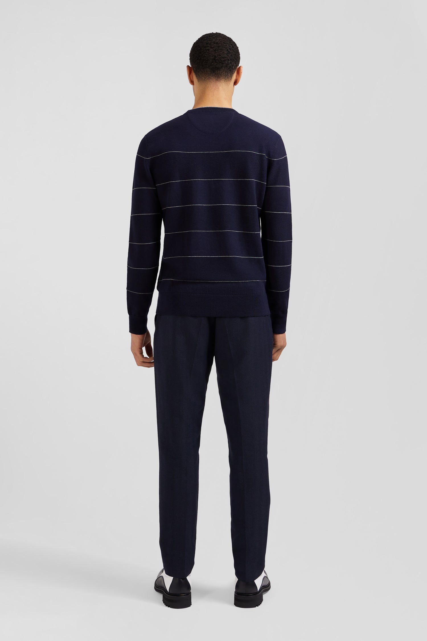 This round-neck sweater, available in shades of navy, grey or brown, features elegant contrasting piping on the collar. Its unique design features alternating stitch and jersey knitting, creating a dynamic stripe effect, with each stripe delineated by a fine contrasting border.