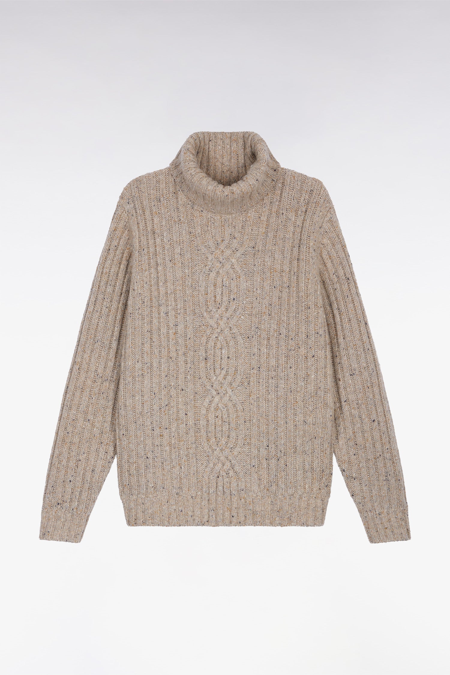 A true character piece, this turtleneck sweater asserts its cosy style with a thick knit in mottled yarn, alternating wide ribbing and a central twist placed on the front and back. Made from a noble blend of virgin wool, alpaca wool and recycled polyamide, this chunky, masculine sweater combines warmth, softness and commitment. An exceptional, timeless and enduring piece for your winter wardrobe.