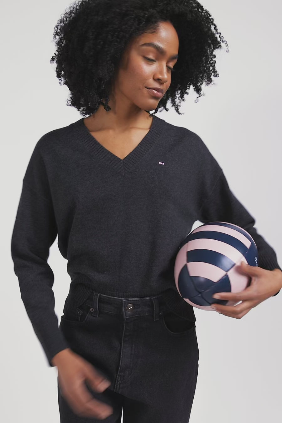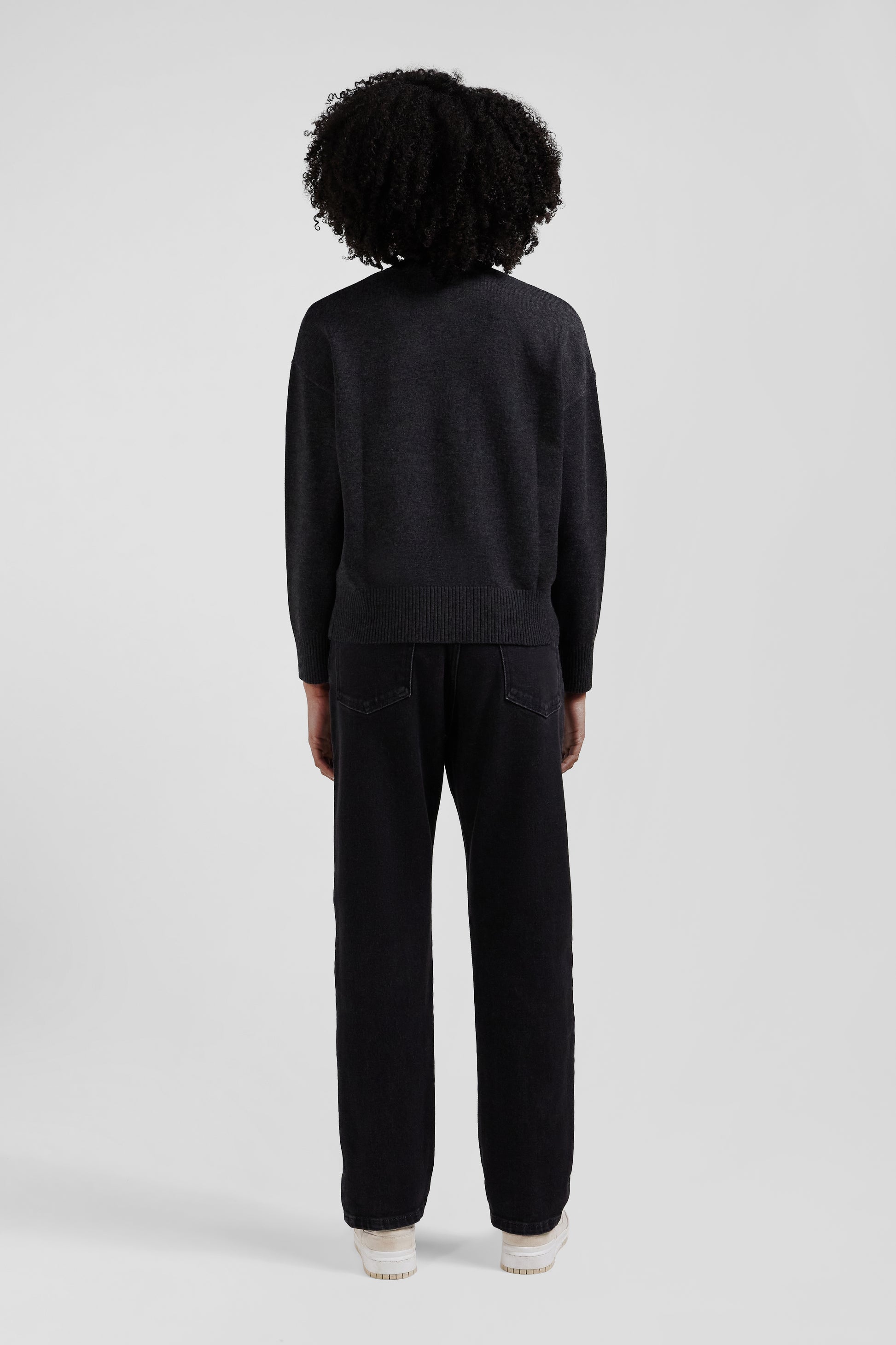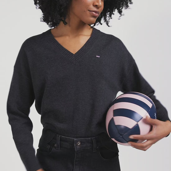 Our V-neck sweater is a timeless addition to any woman's wardrobe. Made from a soft blend of wool and cotton, natural fibers with multiple properties, this sweater offers a relaxed, slightly loose fit for optimum comfort. With its discreet embroidery of our bow tie logo, this sweater embodies the French Flair elegance of our House. Available in a range of colors, it blends easily with a variety of outfits, ideal for a chic everyday look.