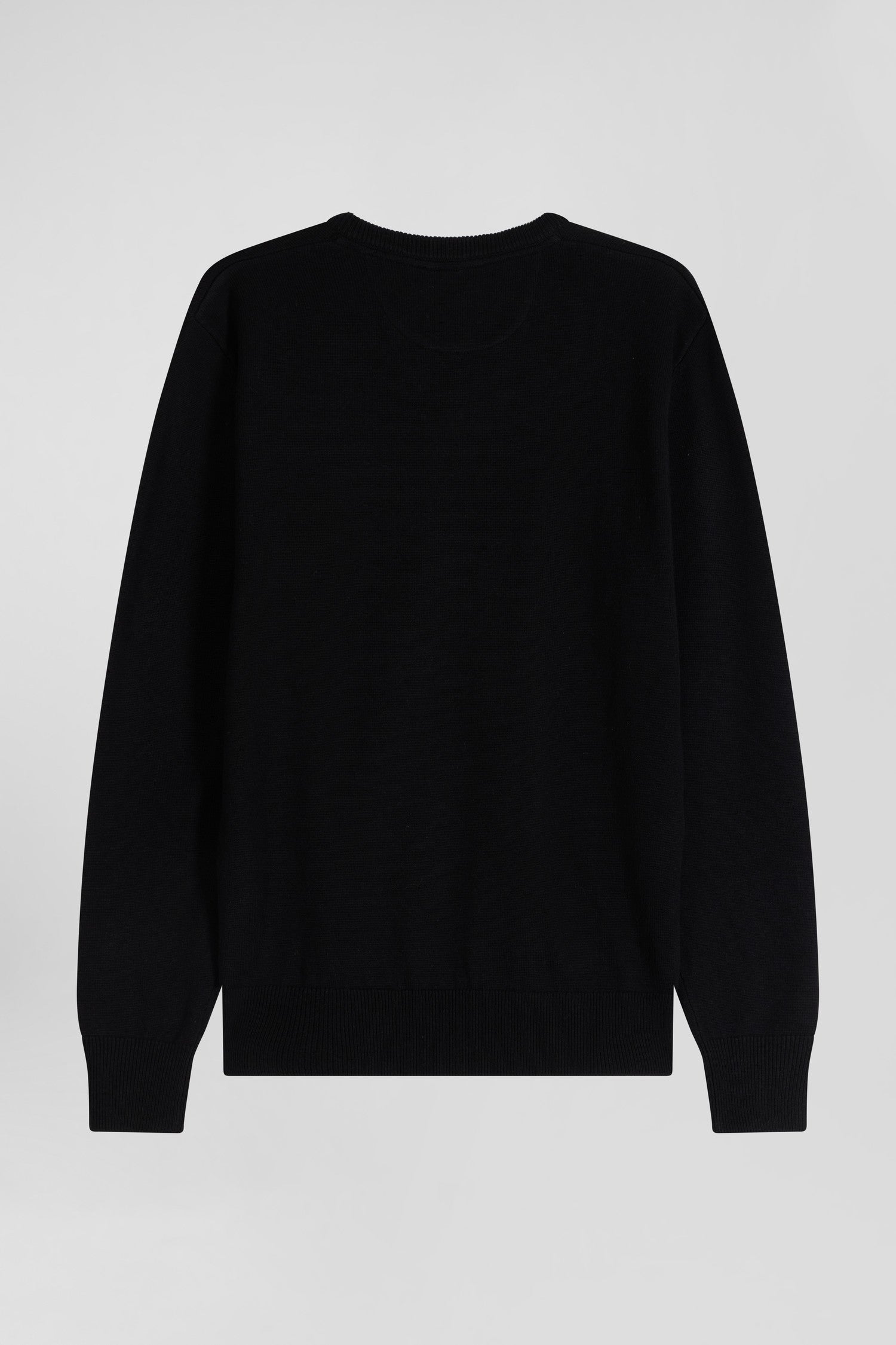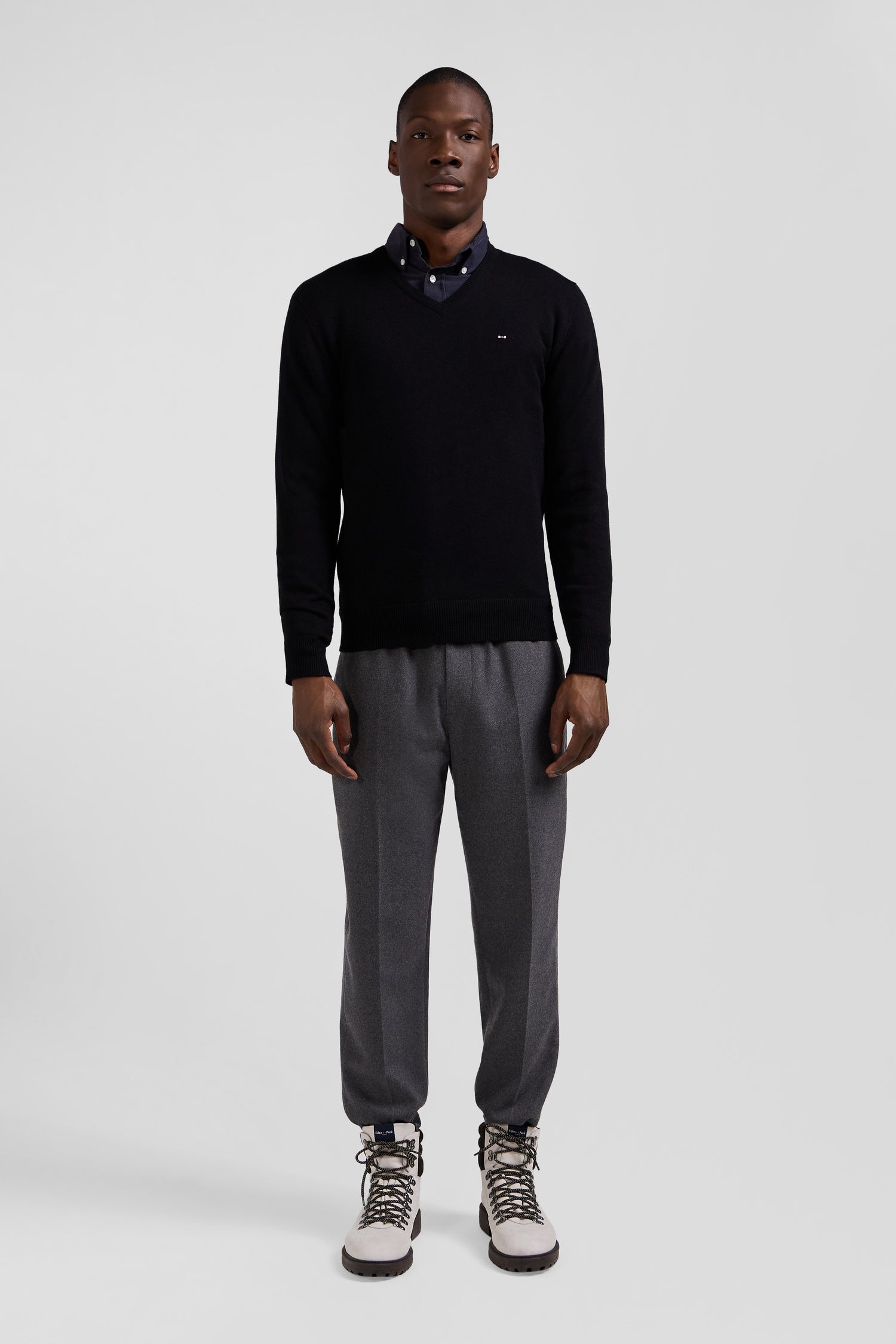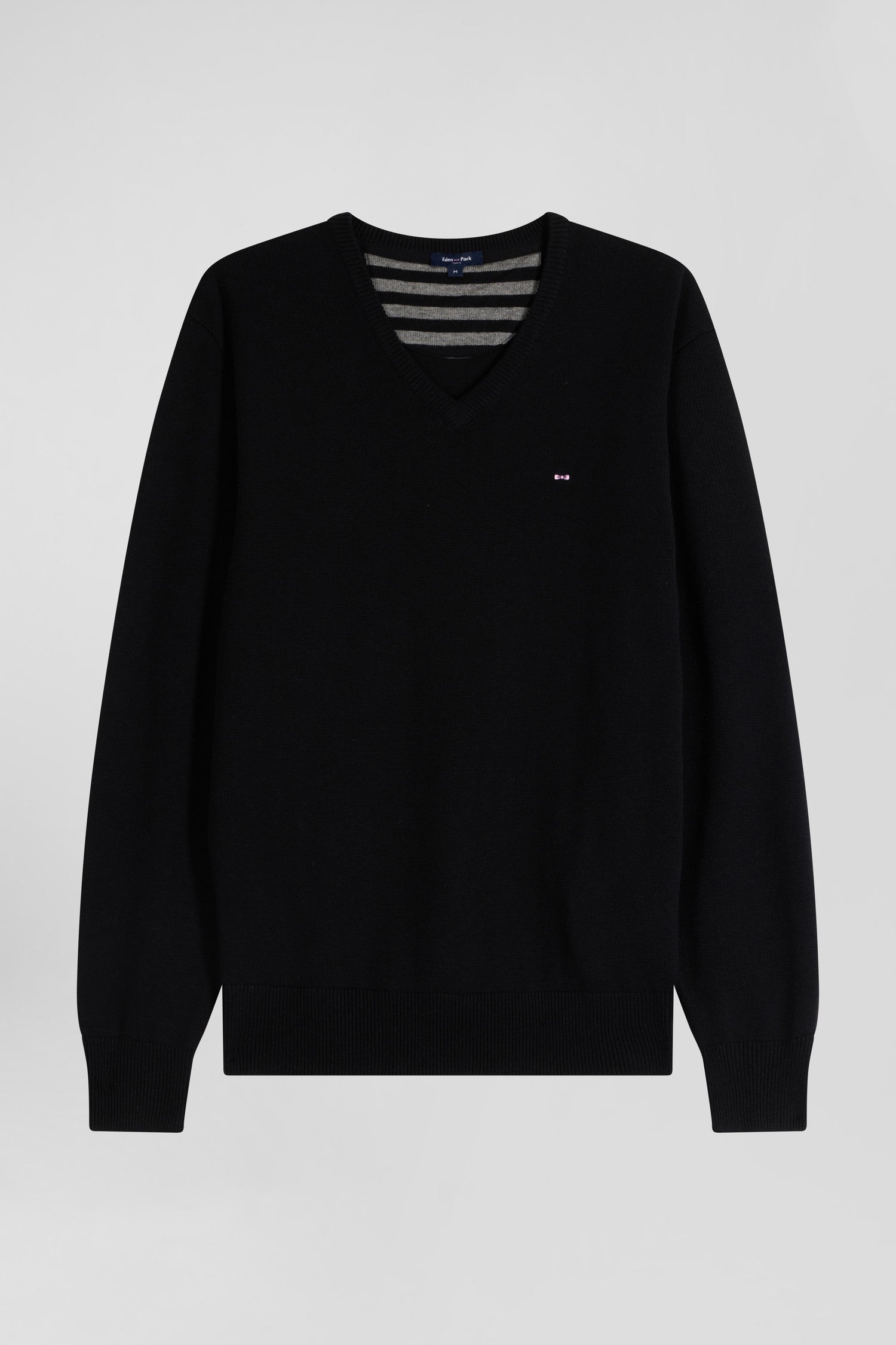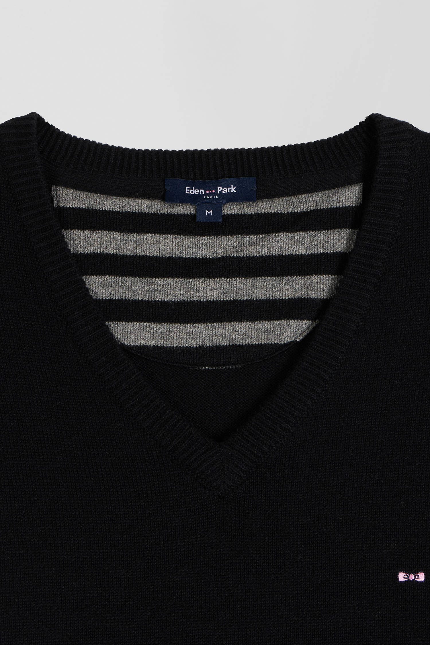 Discover the softness of a jersey knit combining the warmth of wool and the lightness of cotton in this plain V-neck sweater. Each hue is enhanced by a hooped striped inner half-moon, varying according to color for an elegant contrast. The embodiment of the company's expertise, this men's sweater is ideal for casual wear with jeans, or for a more formal look in the depths of winter, under a blazer.
