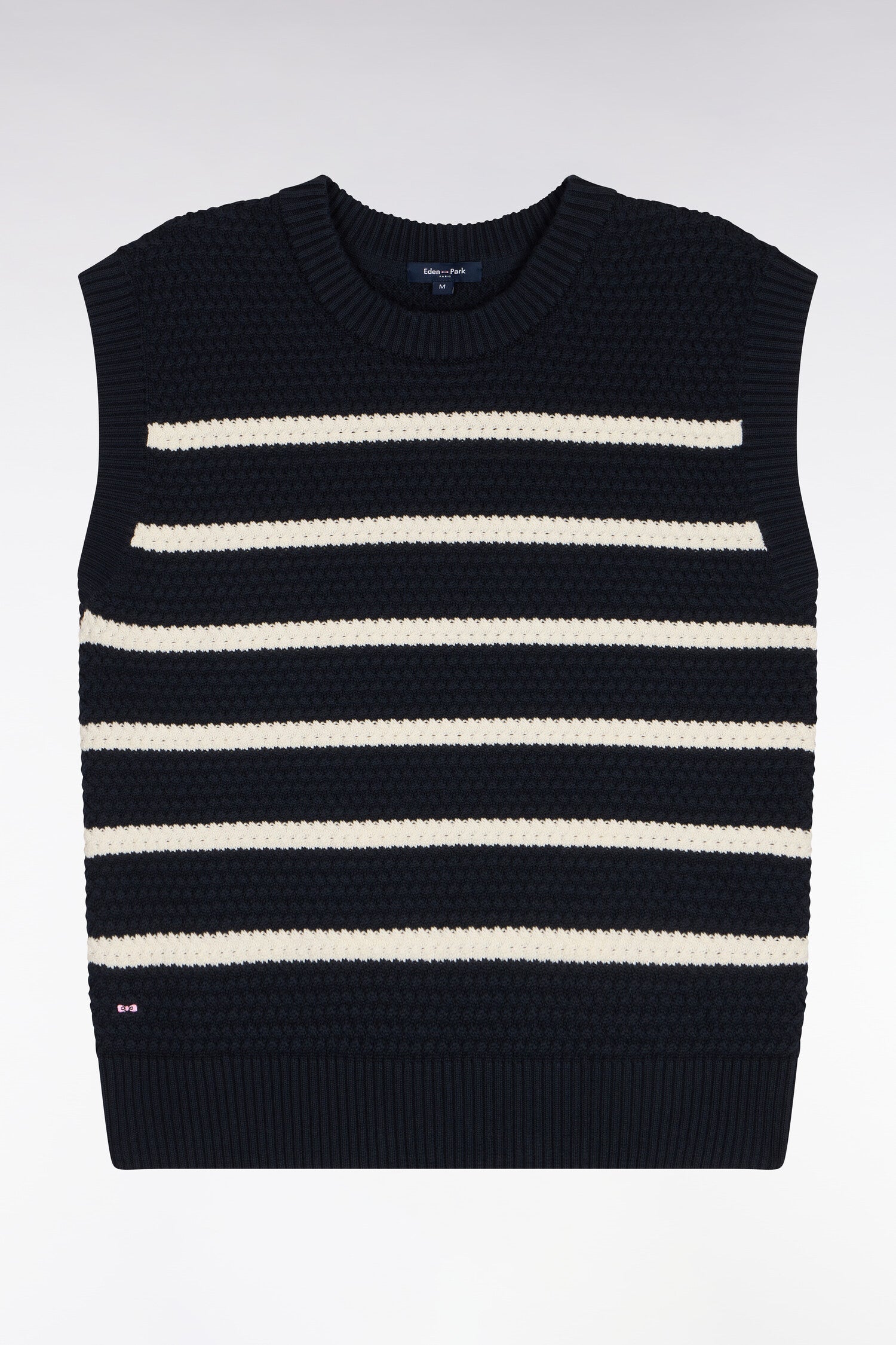 Ce pull rayé sans manches en maille tressée décline l’esprit balnéaire de la marinière dans une version féminine et contemporaine. Sa texture riche et son col rond épuré en font une pièce idéale pour l’été. Proposé en beige ou en marine, il se porte parfaitement sous le cardigan assorti porté ouvert pour un twin-set coordonné chic, ou seul sur un pantalon à jambes larges pour une allure effortless de la ville à la plage.