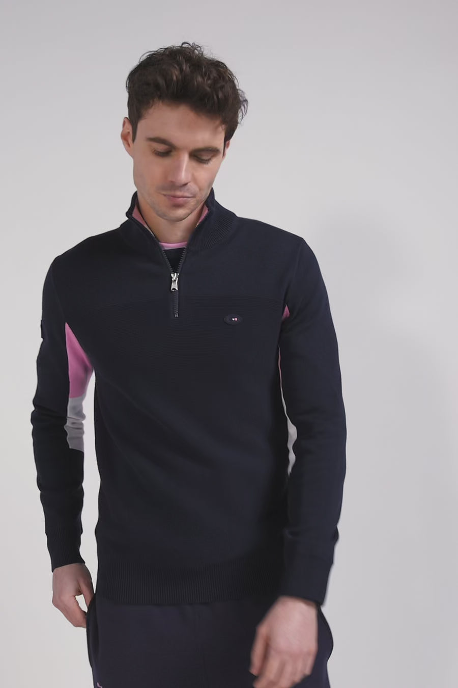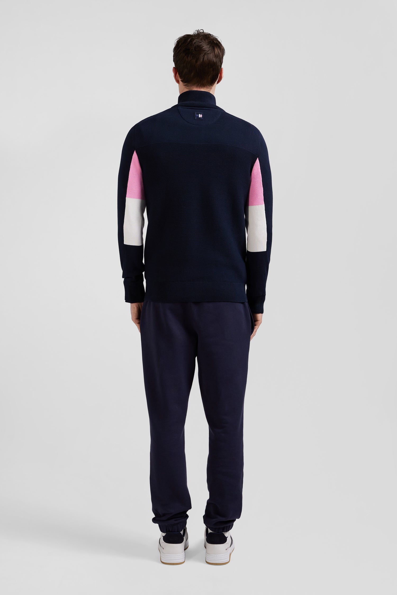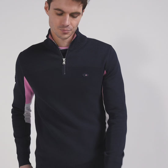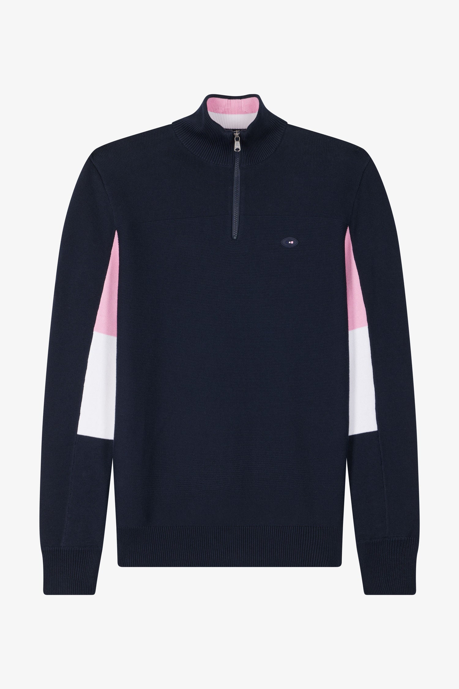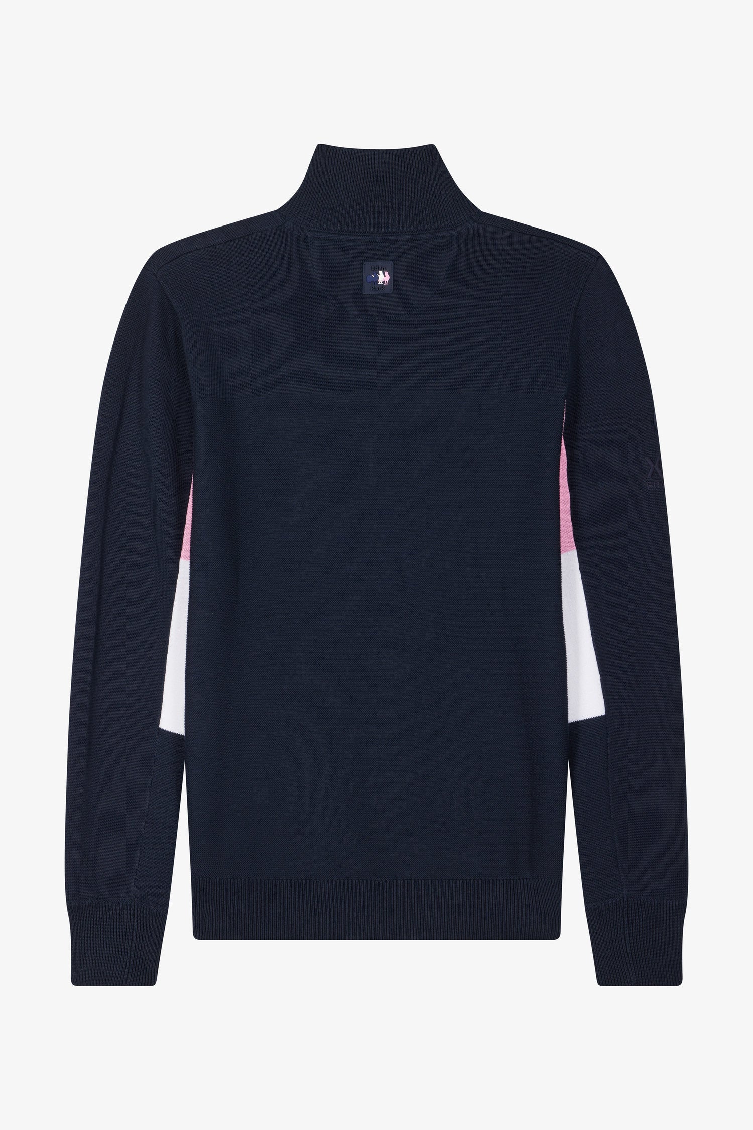 Opt for sporty elegance with this navy blue cotton zipped pullover featuring the emblems of the XV de France. Its straight Regular fit is enhanced by distinctive pink embroidery of the French rooster, a XV de France badge on the back and a second Eden Park silicone badge, celebrating this partnership with pride and style.