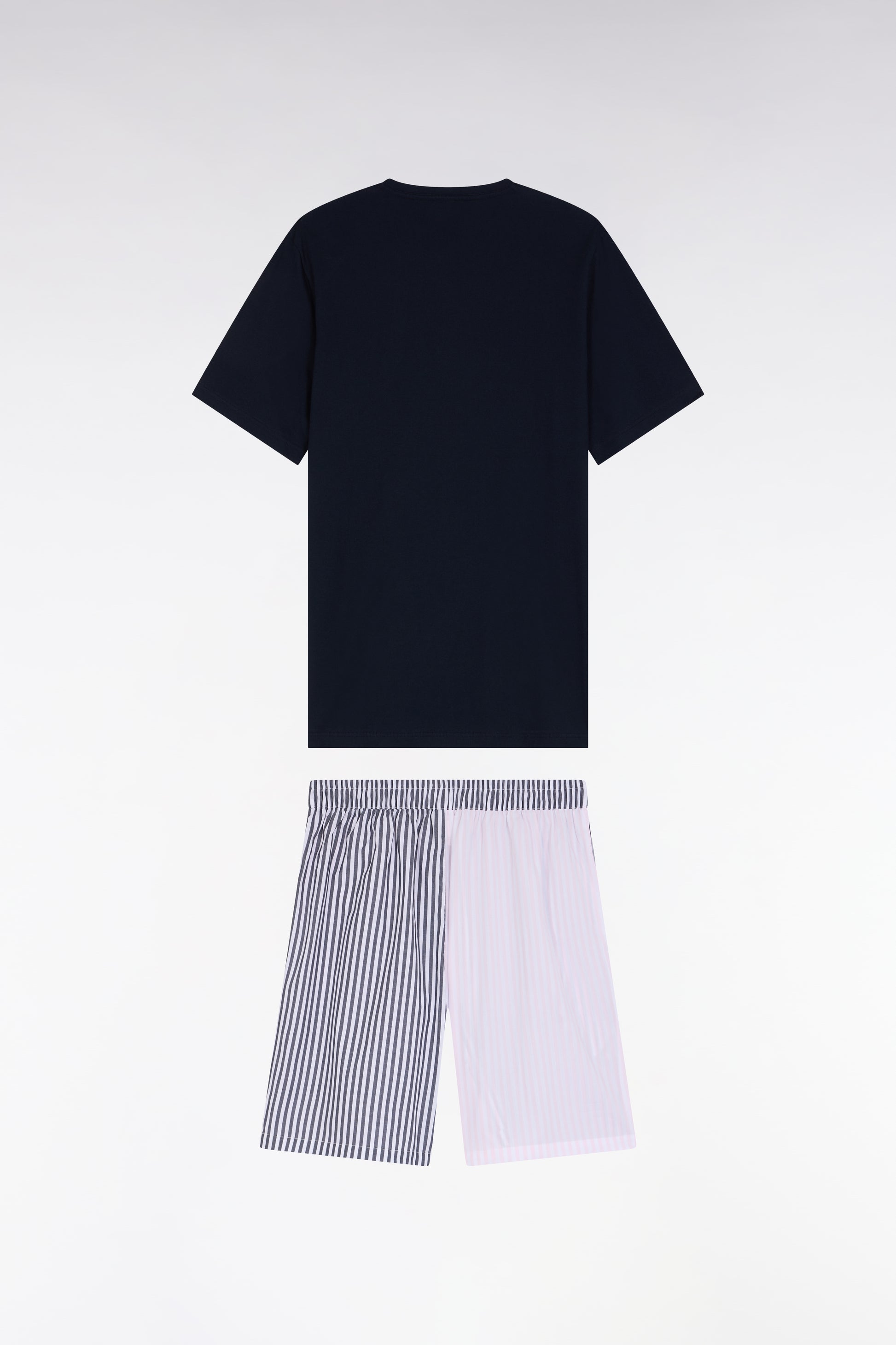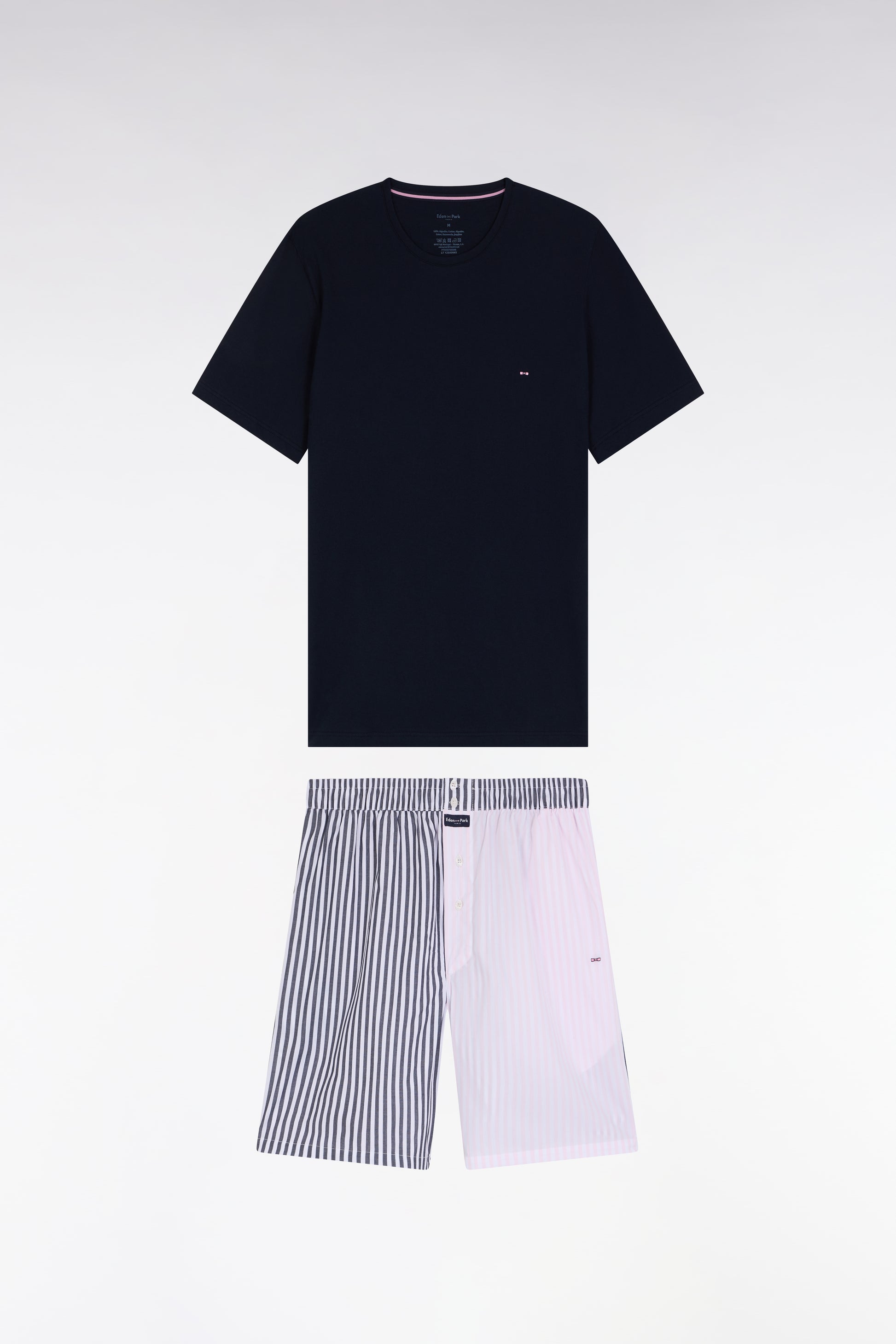These short pyjamas feature a navy short-sleeved t-shirt with round neck and cotton shorts with elasticated waistband and stripes. These masculine pyjamas offer optimum comfort and a sporty-chic look for your moments of relaxation. Available in navy and sky or navy and pink, our signature colors.
