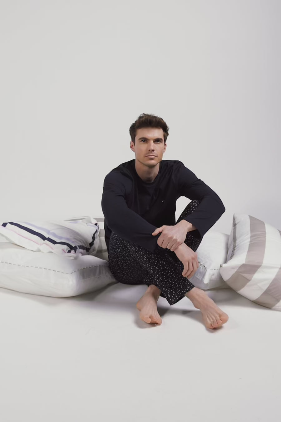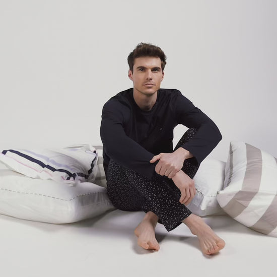 Our elegant navy pyjama set is ideal for moments of relaxation. The cotton pants feature a graphic micro-pattern and an elasticated waistband for optimum comfort, accompanied by a long-sleeved T-shirt. Simple and refined, these pyjamas promise soft, trendy nights.