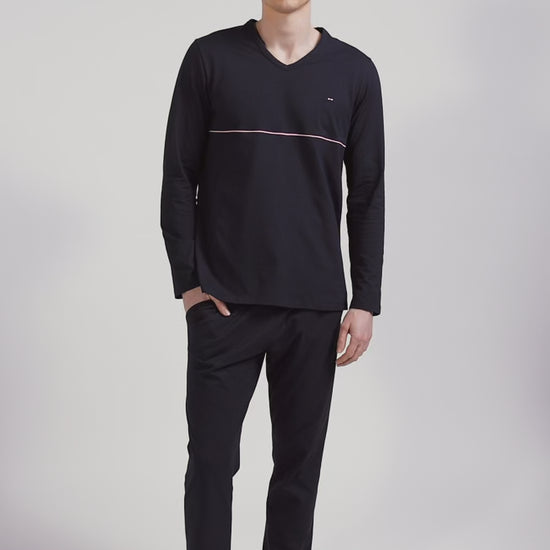 This navy blue pajama set features a long-sleeved T-shirt brightened up by contrasting piping on the chest. Pants with a branded elasticated waistband provide comfort and support for your nights of sleep and weekend relaxation.