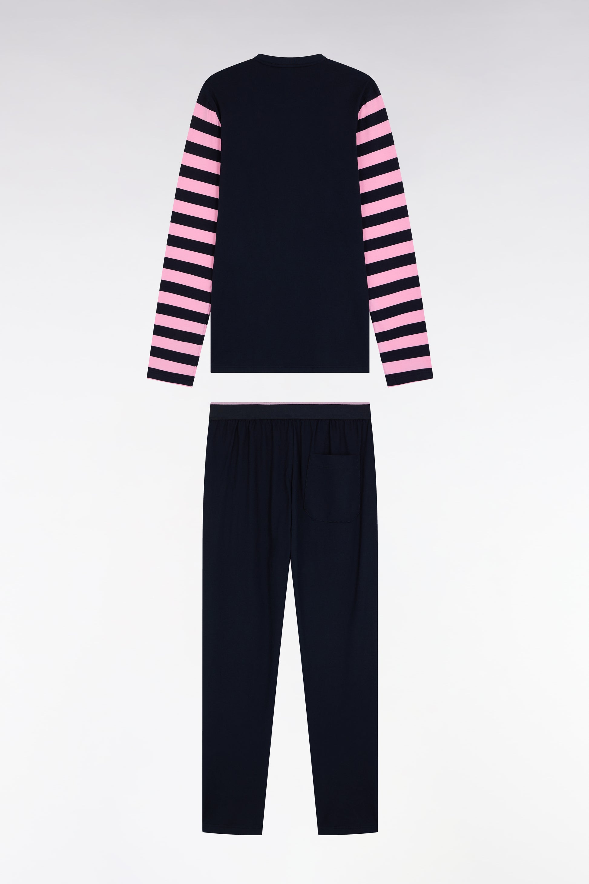 These long pyjamas revisit the rugby spirit of the Eden Park collections with a long-sleeved T-shirt with pink striped sleeves. Its round-neck top is coordinated with plain elasticated-waist pants embossed with our house logo. Made in soft jersey, they offer comfort and character for peaceful nights.