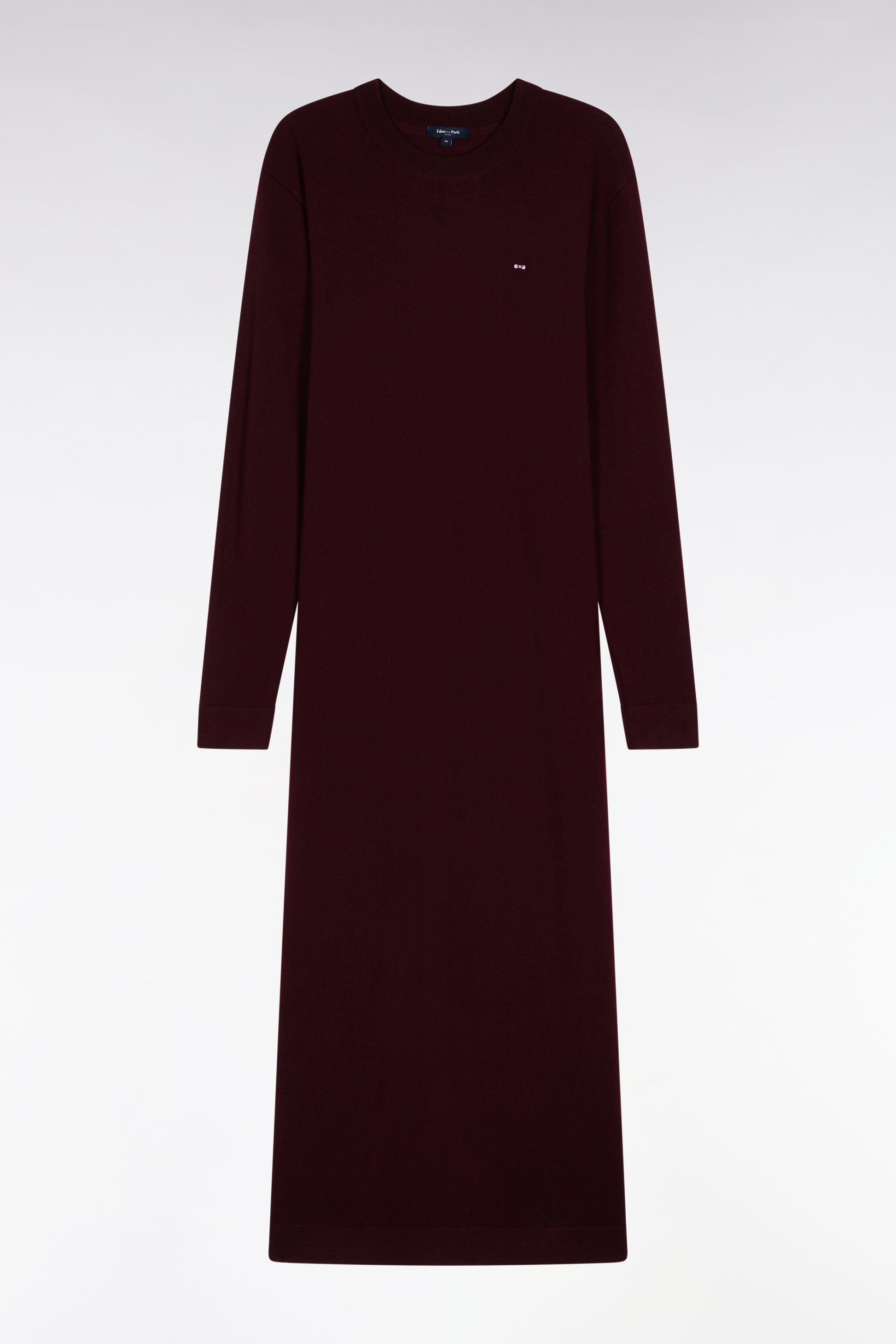 A classic in women's wardrobes, the knitted tube dress is offered here in navy or burgundy merino wool for soft, warm all-day wear. Soberly adorned with our bow-tie embroidery, this autumn-winter dress goes with everything, from the most elegant silhouettes to casual outfits. Its sleek round collar reinforces the timeless, refined look of this versatile model.