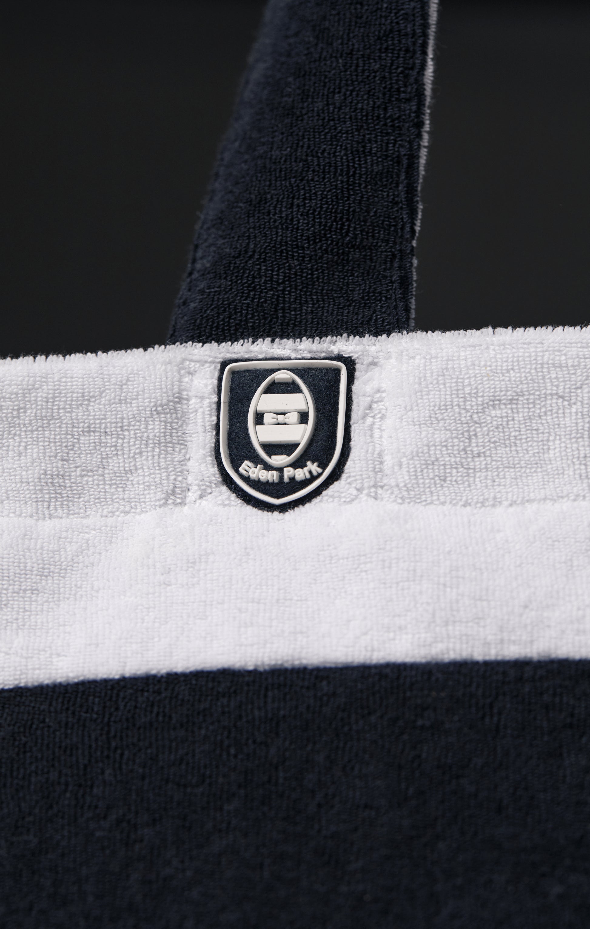 This exclusive tote bag has been entirely imagined and crafted from emblematic pieces of our House selected from our women's archives. Two women's terrycloth swimsuits, one navy blue and the other white, were hand-cut and assembled to form broad stripes, a nod to the graphic aesthetic of our fashion collections. For the lining, our atelier chose a striped fabric scrap, also from Eden Park's dormant stock, to which we added an inside zipped pocket, the zip of which comes from a historic piece. Every detail of this practical, lightweight tote bag, such as the discreet upcycled crest near the handles, illustrates our commitment to reusing existing resources to create a unique accessory that is functional, durable and original. This navy and white striped terrycloth bag is available in a limited-edition Pap'Atelier capsule on our website. Dimensions: 35cm x 39cm