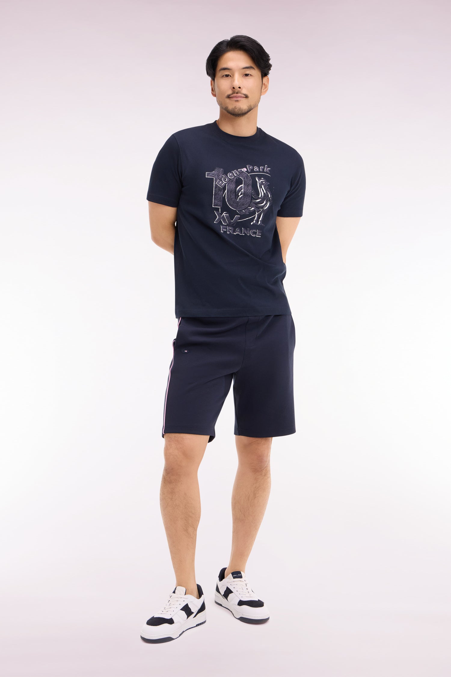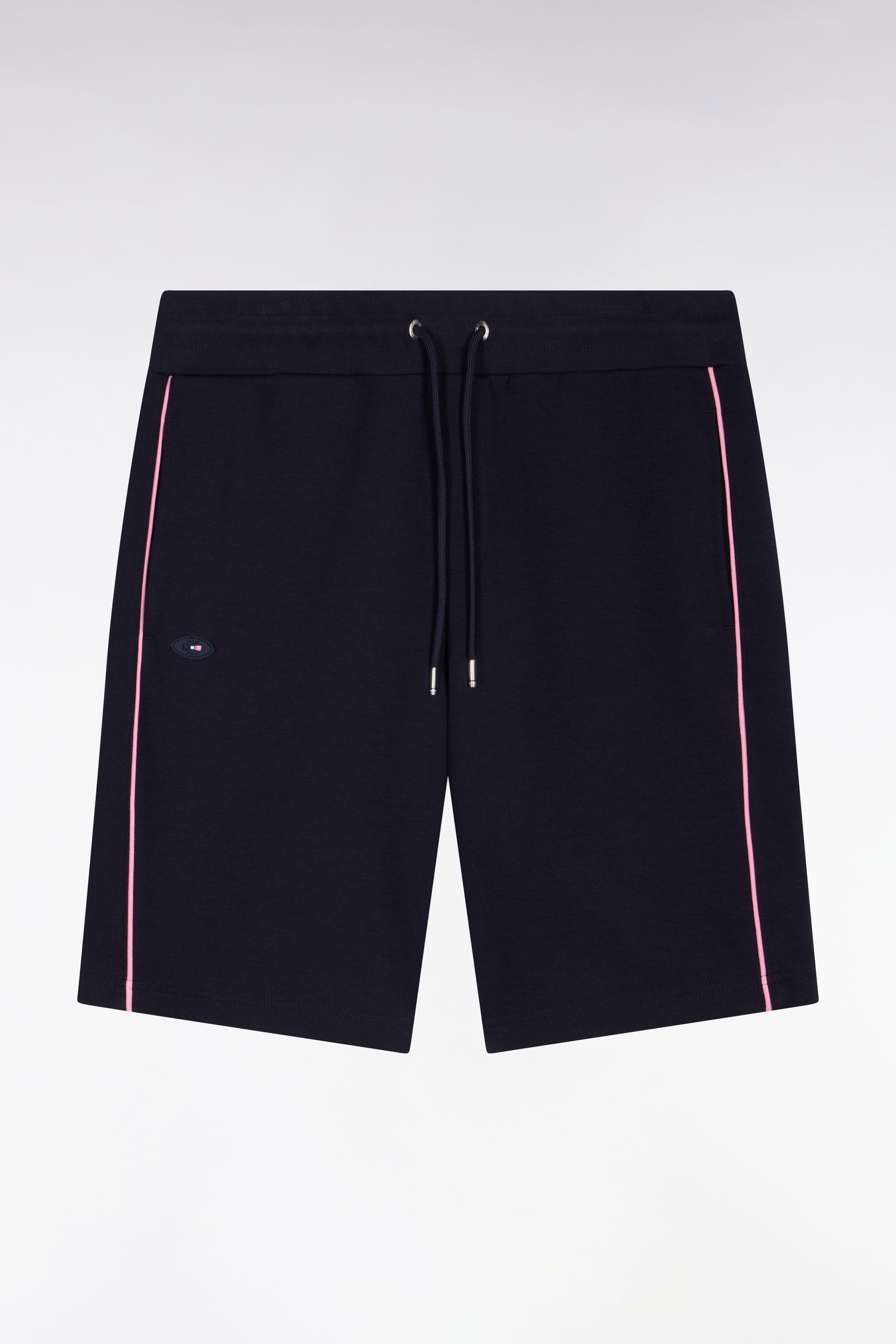 Ce short en molleton interlock revisite le style rugby dans une version raffinée pensée pour la ville. Des passepoils contrastés soulignent la jambe pour une touche graphique et élégante alors que badges et broderies XV de France scellent une passion partagée pour l'ovalie. Idéal pour les moments de détente comme pour vos sorties du week-end, ce short marine se coordonne aisément au sweatshirt zippé assorti pour une silhouette contemporaine aux influences athlétiques.