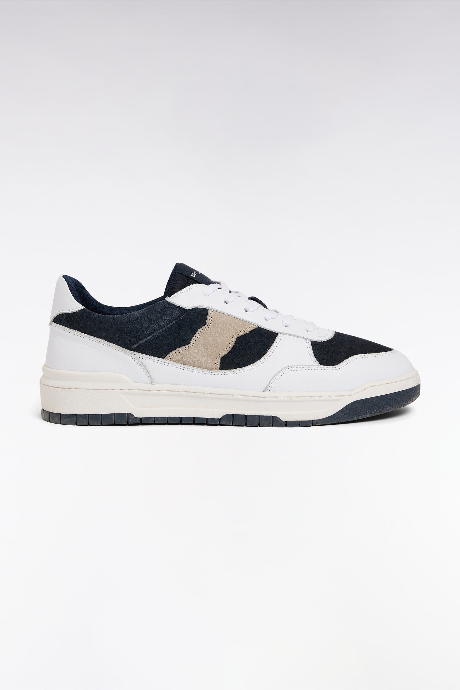 Cette sneaker en cuir lisse blanc animé de cuir suédé marine et beige séduit par sa ligne sportive et son allure moderne. Ses découpes suédé nœud papillon apporte une élégance discrète, tandis que la semelle contrastée assure confort et stabilité tout en rappelant les lacets. blancs. Facile à associer, ces sneakers homme accompagnent aussi bien un jean qu’un jogging ou un chino.