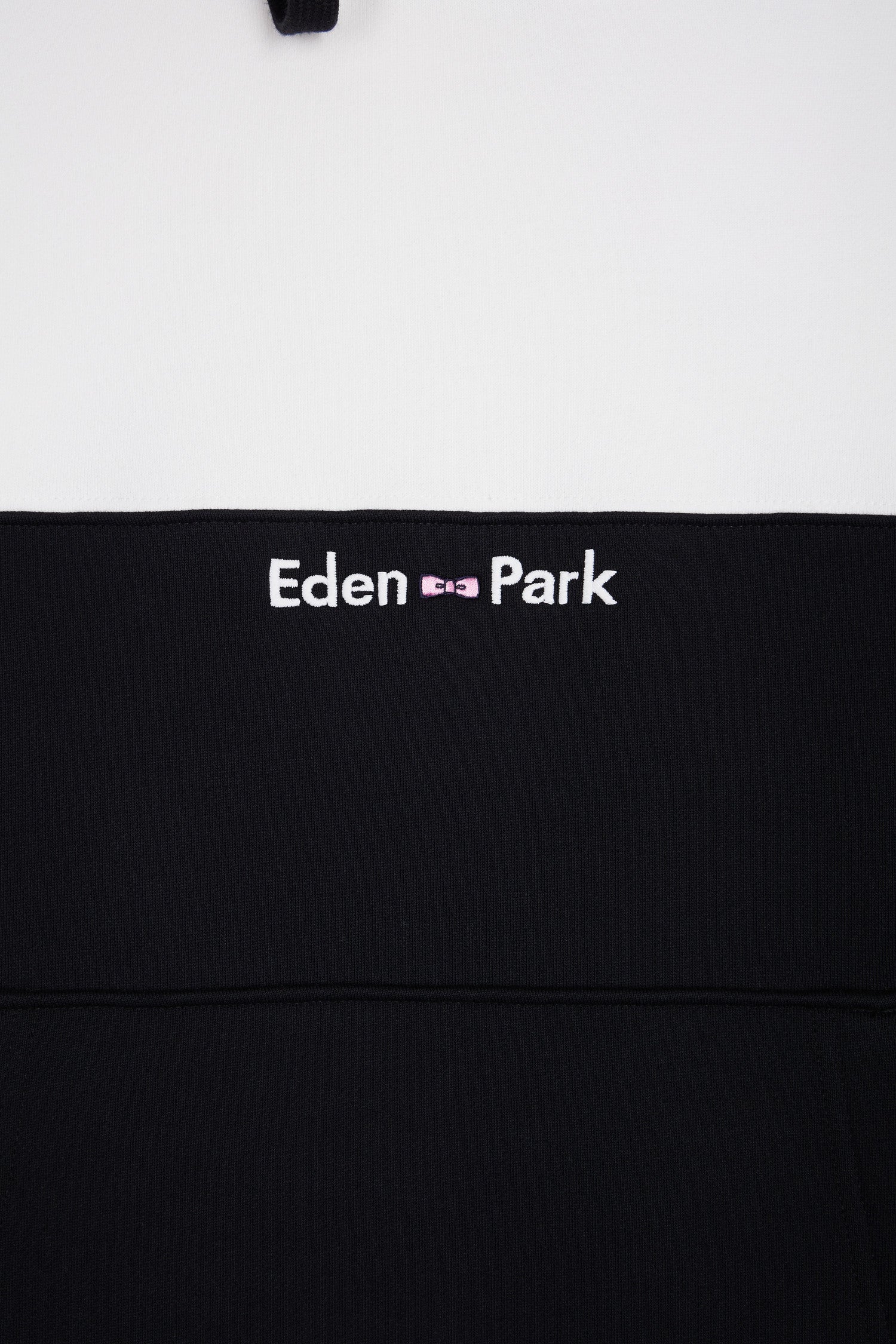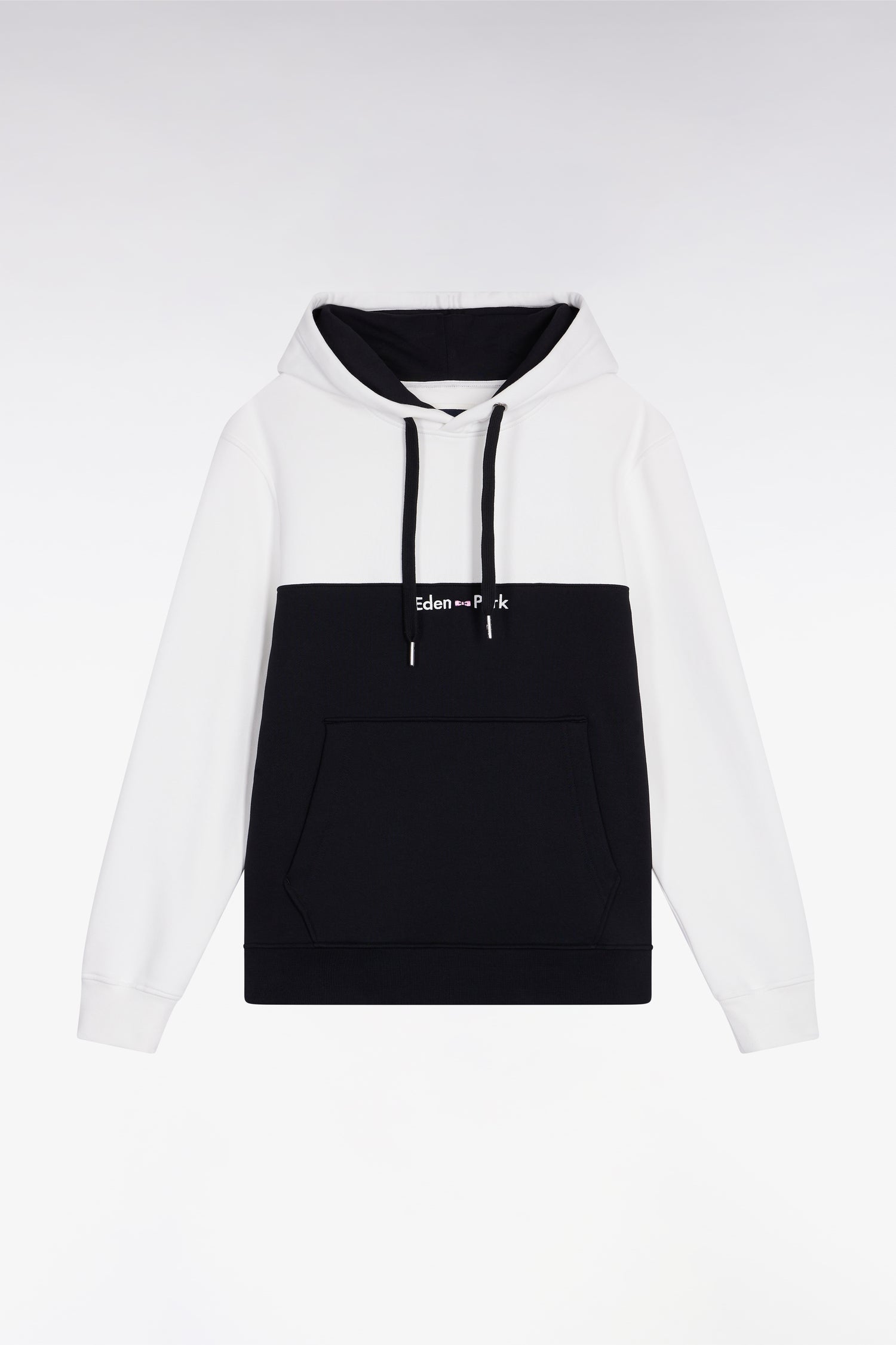 With its straight cut and soft brushed fleece, this two-tone sweatshirt in navy and pink, sky or white embodies the essence of our House's comfort. Eden Park embroidery on the front discreetly asserts its identity, while silver metal trim and ribbed cuffs and hem reinforce its polished look. A graphic patch on the inside of the hood and navy drawstrings for added elegance.