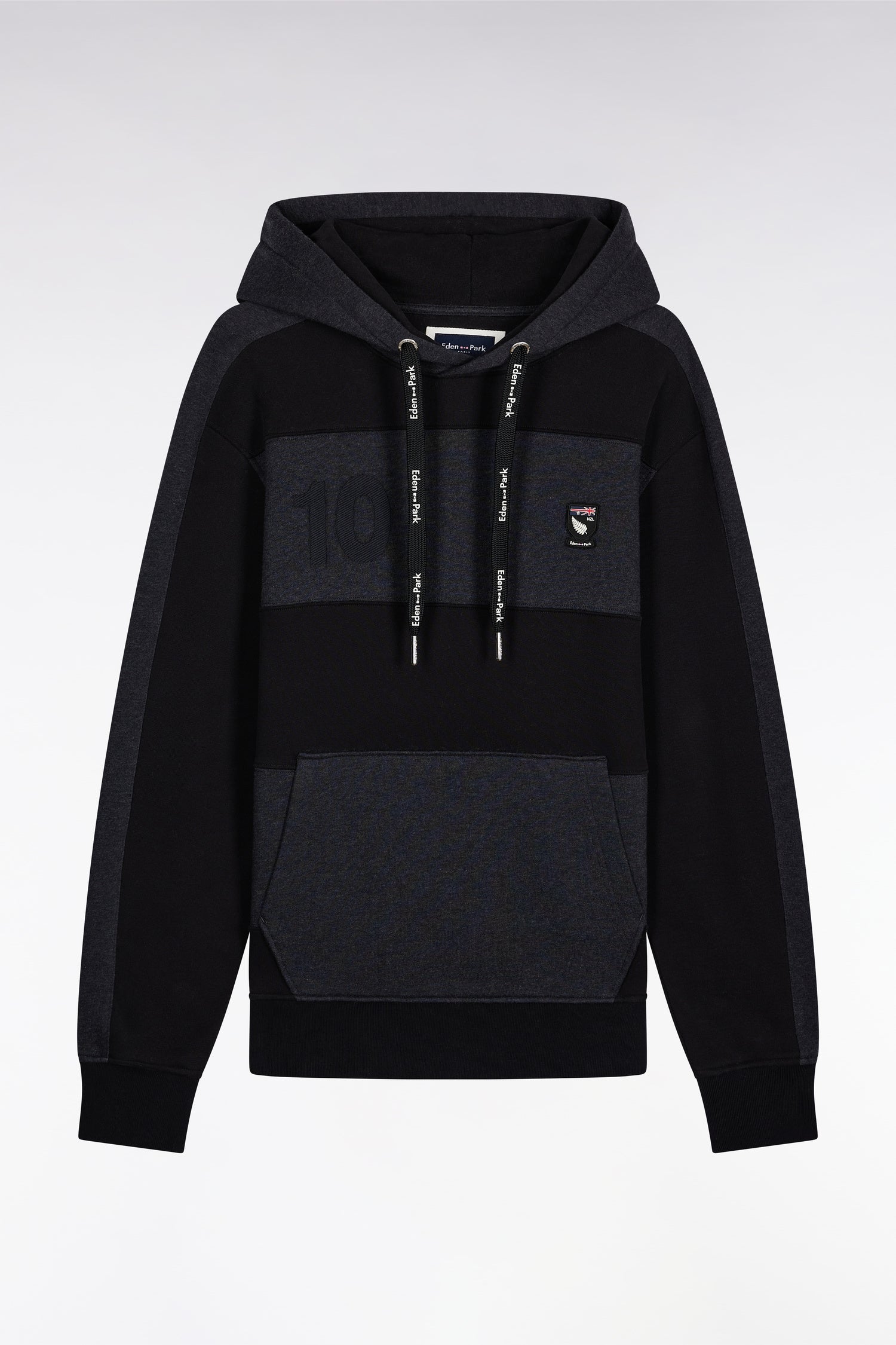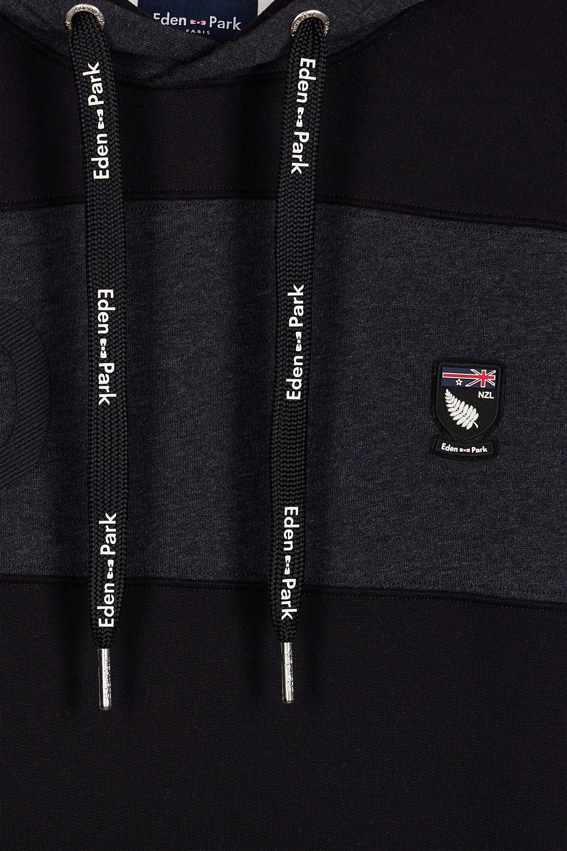 A staple of the casual wardrobe, this hooded sweatshirt pays homage to New Zealand, the emblematic land of rugby. Available in 2 combinations, beige and light gray or black and dark gray, it is inspired by the striped rugby jersey for a graphic silhouette. Number 10 embroidery, emblematic crest and signature drawstrings assert the Eden Park DNA.