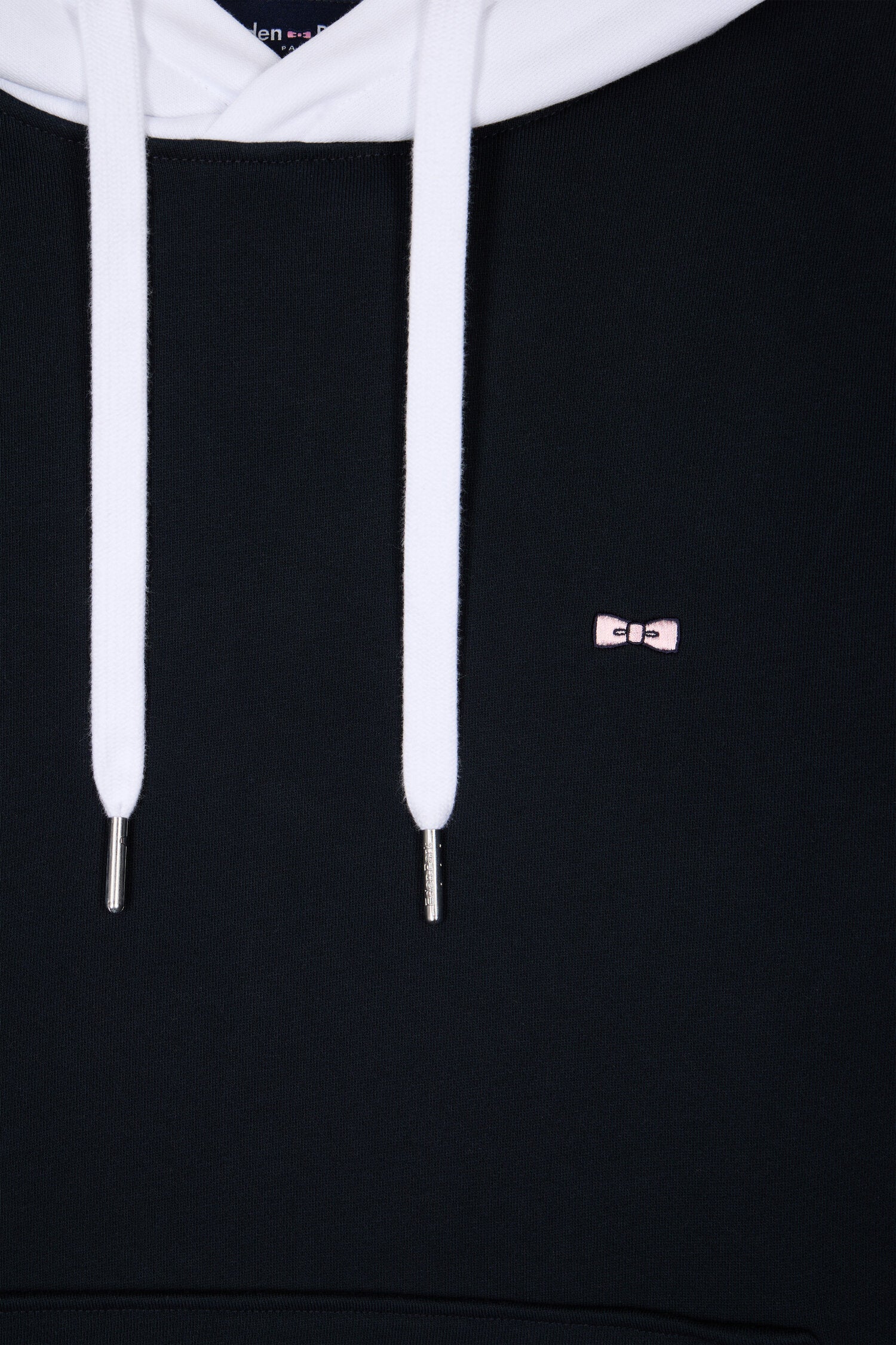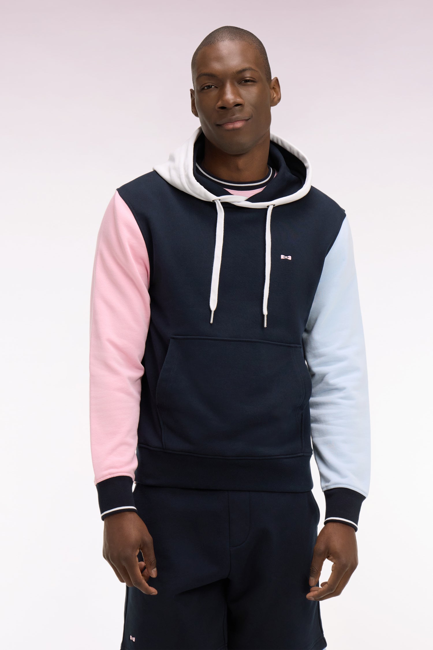 Ce sweatshirt à capuche en molleton coton doux revisite les classiques du vestiaire de notre Maison avec ses finitions précises s'amusant des associations de couleurs : capuche blanche doublée marine, manches bicolores rose et ciel, nos coloris de prédilection sans oublier ses finitions bords-côtes rayés aux poignets et l'inimitable broderie nœud papillon Eden Park sur la poitrine. Au dos, ce sweatshirt à capuche révèle une broderie identitaire rehaussée de notre tissu cravate ton sur ton. Son allure dynamique et ses découpes nettes en font un modèle résolument contemporain à porter avec le short en molleton coordonné, rappel de ses manches bicolores.