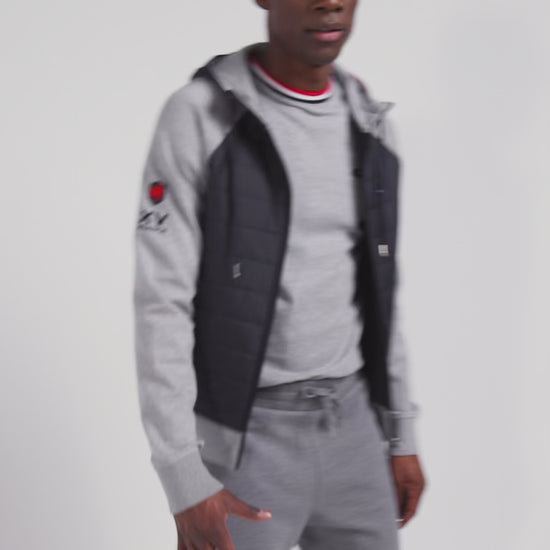 Adopt a versatile outfit with this hybrid model, half sweatshirt, half mid-season jacket. Its timeless color is combined with quilted trims reminiscent of a light down jacket, perfect for the arrival of autumn. The hood, adorned with tricolor stripes, echoes Eden Park's take on French elegance, while the XV de France badge is a proud reminder of our House's passion for rugby. Ideal for a sporty look or a casual outing, this hoodie is the epitome of athletic chic.