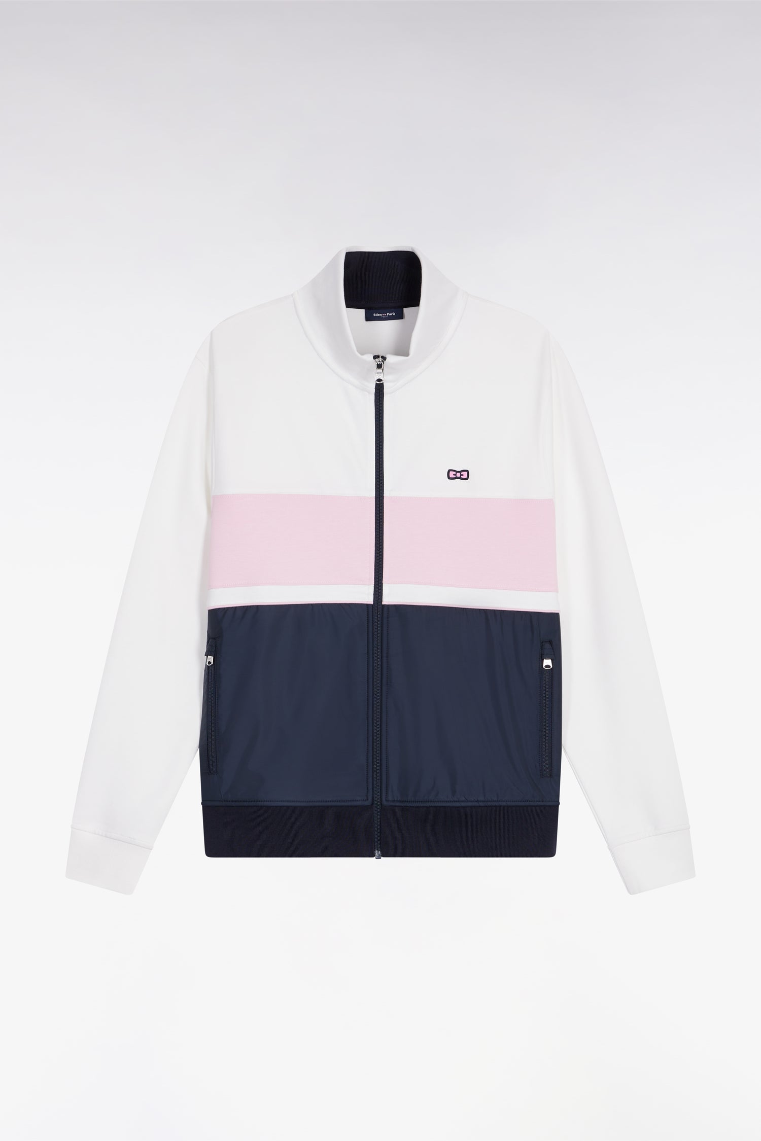 This zip-up sweatshirt with stand-up collar features a balanced tricolor construction and subtle interplay of materials. The off-white fleece top is accented by a pale pink stripe, while the contrasting navy nylon bottom adds structure and modernity. Wear as a sweatshirt or mid-season jacket