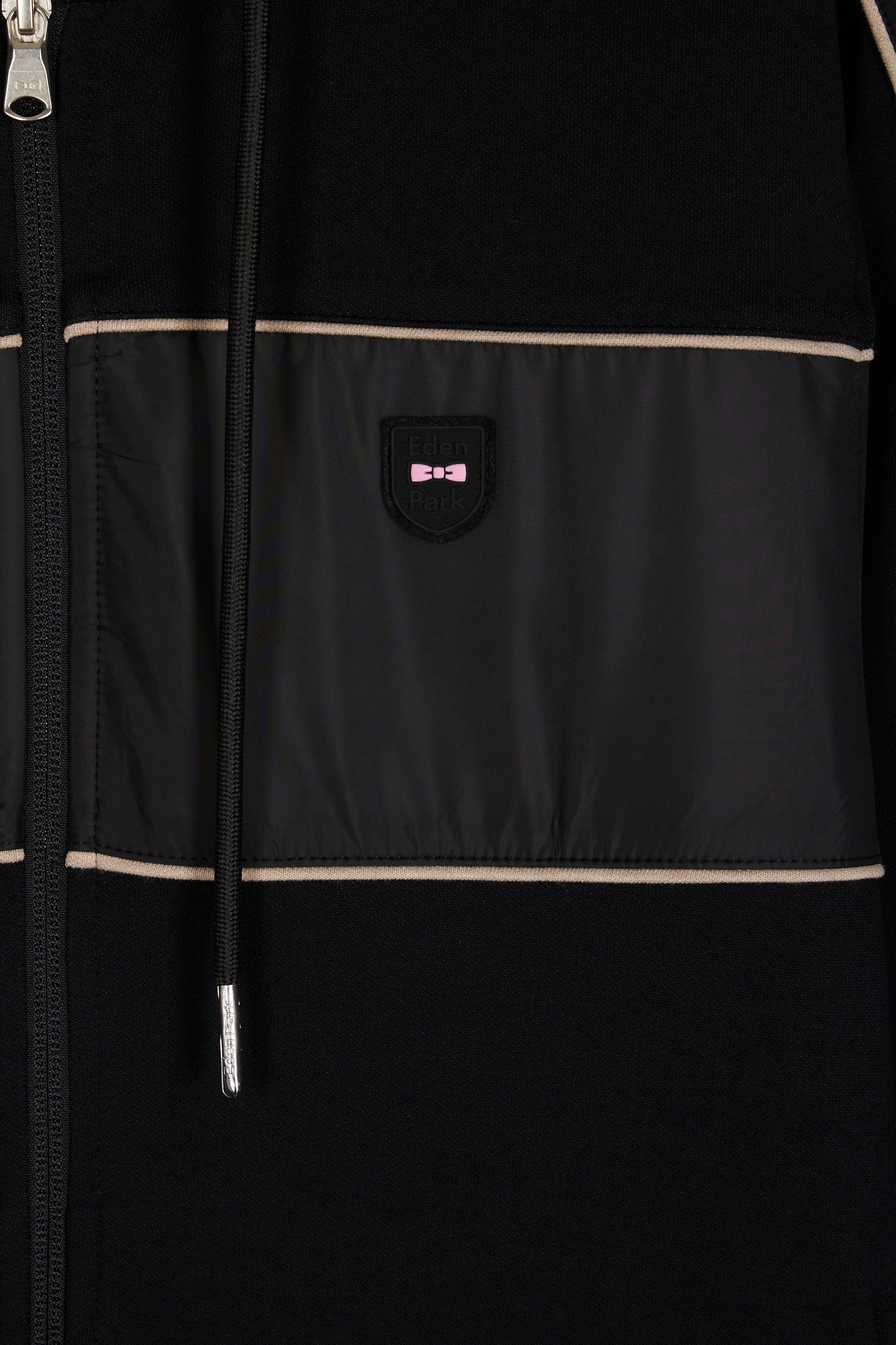 Zip-up hooded sweatshirt in black and beige fleece and nylon