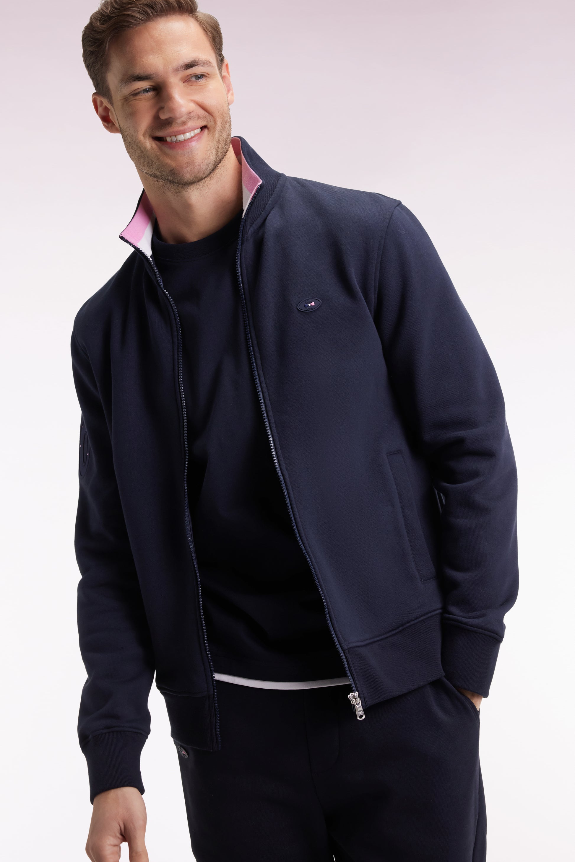 This zip-up sweatshirt with stand-up collar and pink piping is elegantly understated, enhanced by signature details. The "10" embroidery on the sleeve is enhanced by a printed tie fabric inlay, a nod to Eden Park's French Flair style.