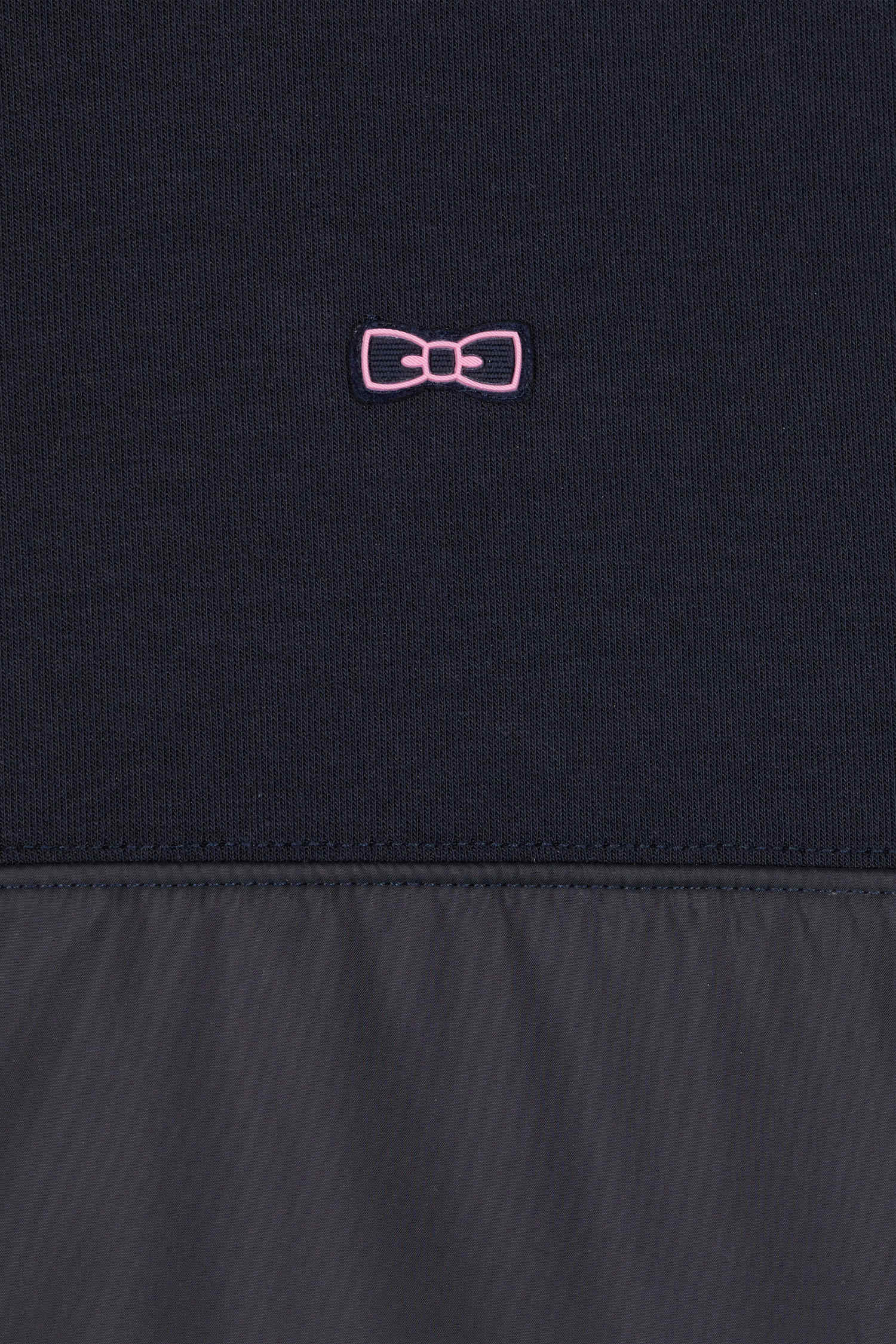 This zip-up interlock stand-up collar sweatshirt features nylon inserts on the sleeves and front, accented with elegant pink piping. The zipped stand-up collar and silver metallic finishing with our Maison's logo add a touch of refinement to this modern, functional garment.