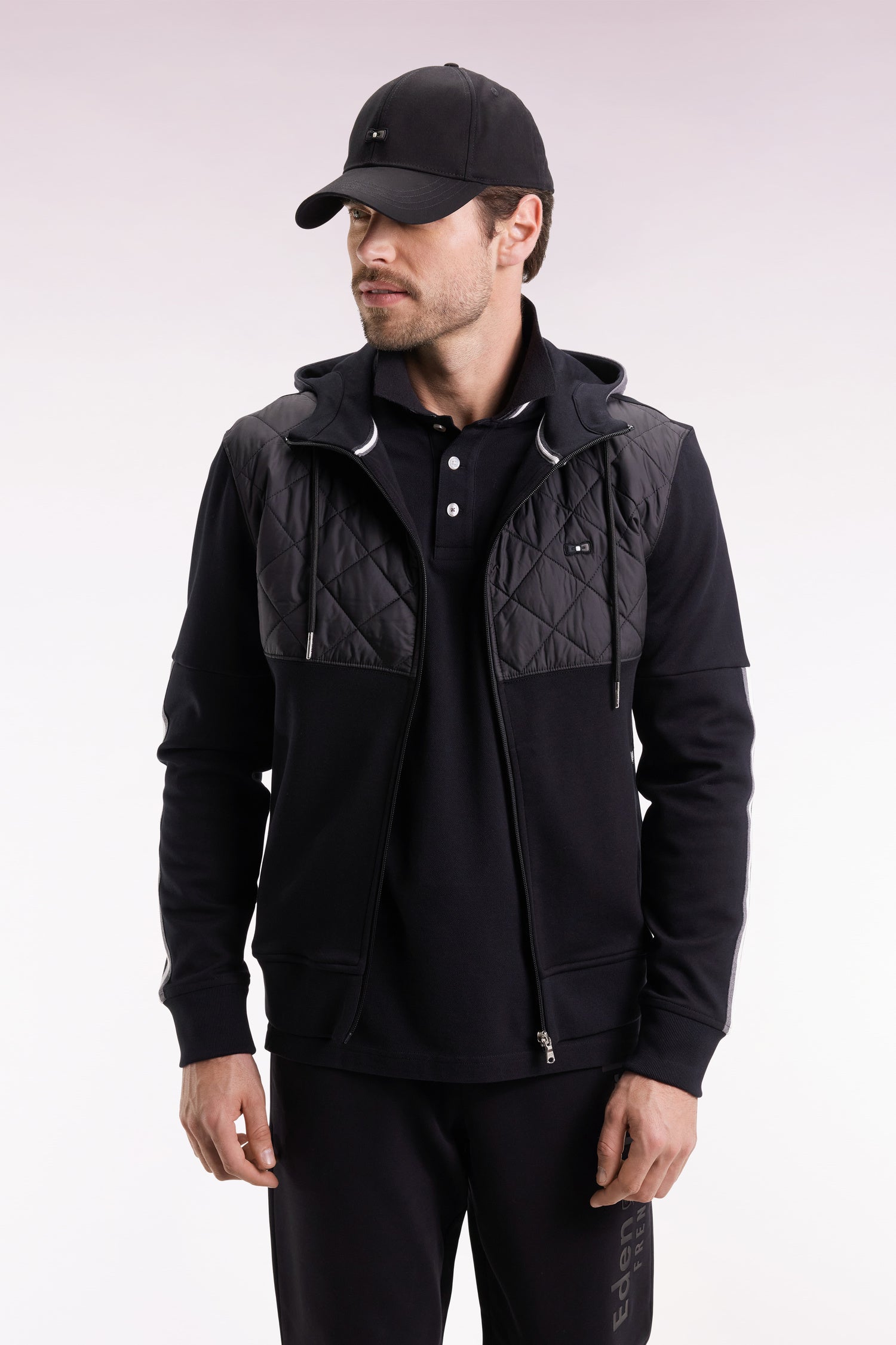 This bimaterial interlock zip sweatshirt is suitable for all seasons. The interlock cotton selected by our company is a soft, thick, stretchy, double-sided knit that offers plush comfort and a great fit. The quilted nylon yoke on the chest, the high neckline and the two-tone hood make this sweatshirt a hybrid piece to be worn as a jacket in mid-season or as a sweatshirt in autumn-winter. The two-tone ribbon knit along the sleeves creates a sporty-chic silhouette. Available in black and gray or navy and pink