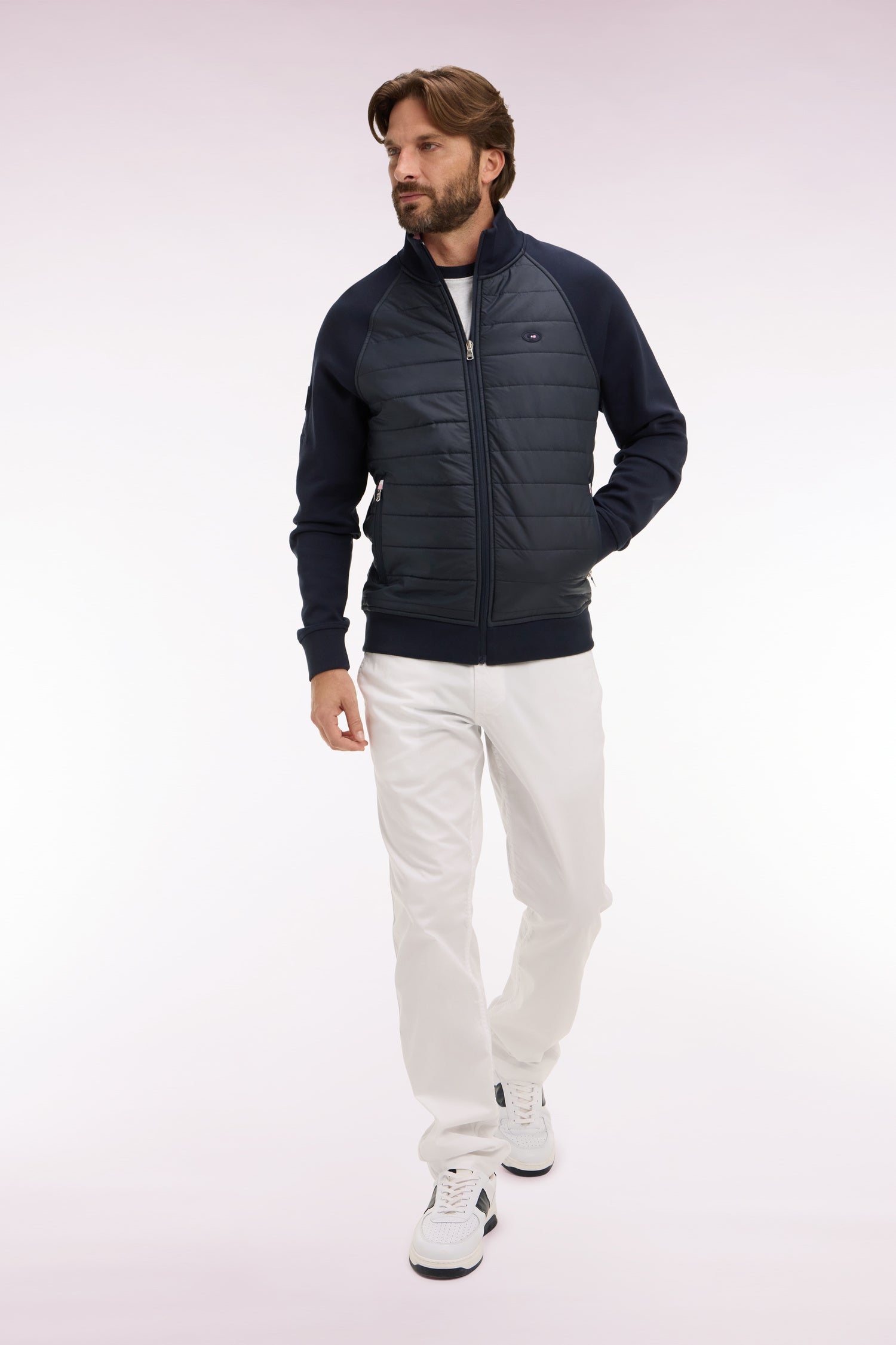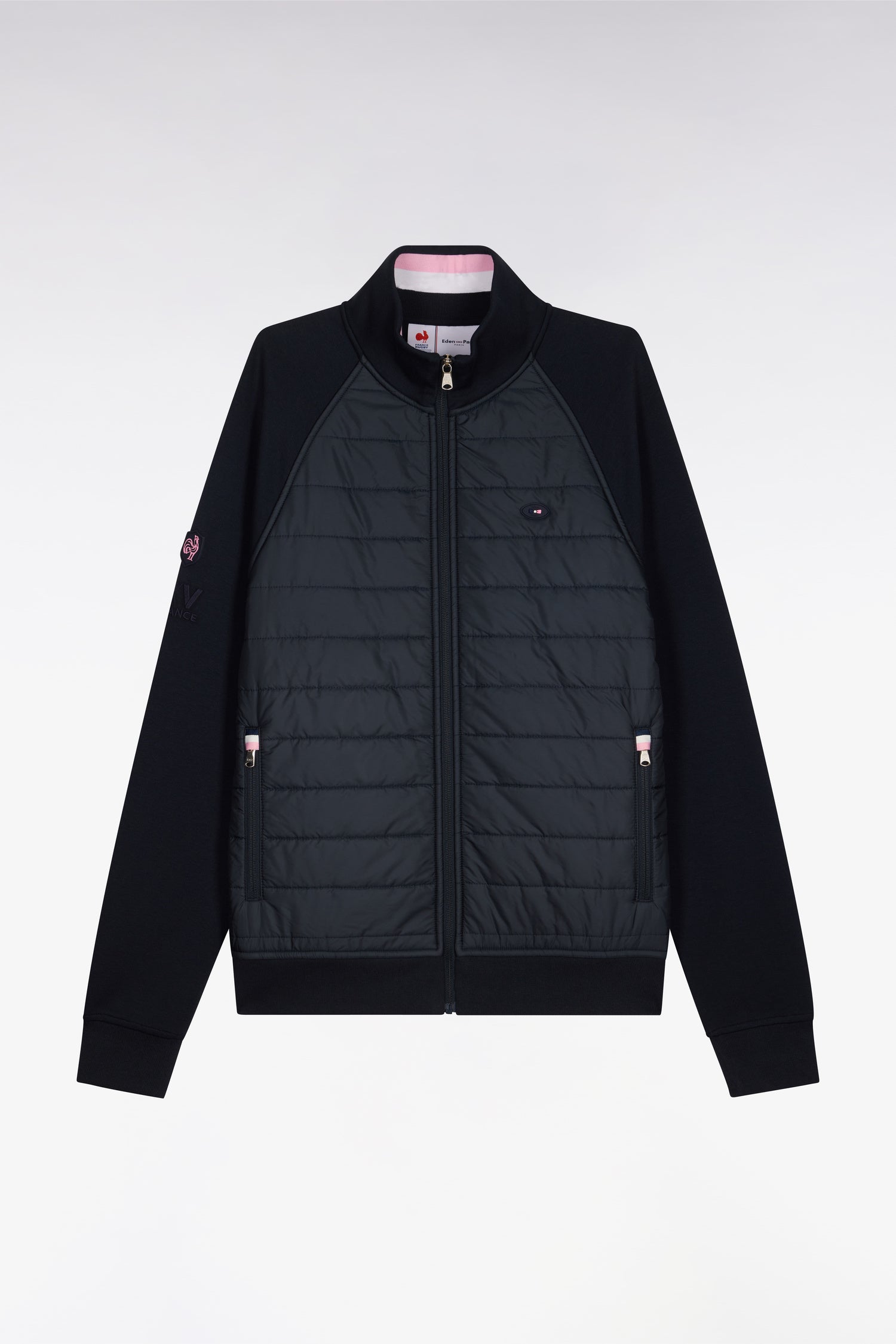 Ce sweatshirt zippé XV de France se distingue par sa parementure frontale matelassée qui évoque les équipements d’entraînement mais aussi nos doudounes masculines. Le contraste entre les manches en molleton et la parmenture texturée apporte un esprit technique chic pour un quotidien urbain. Une pièce hybride, idéale comme veste légère en intersaison ou à porter en sweatshirt structuré.