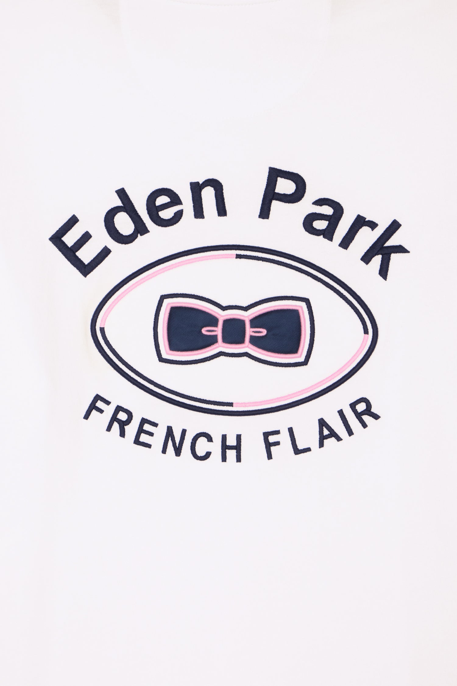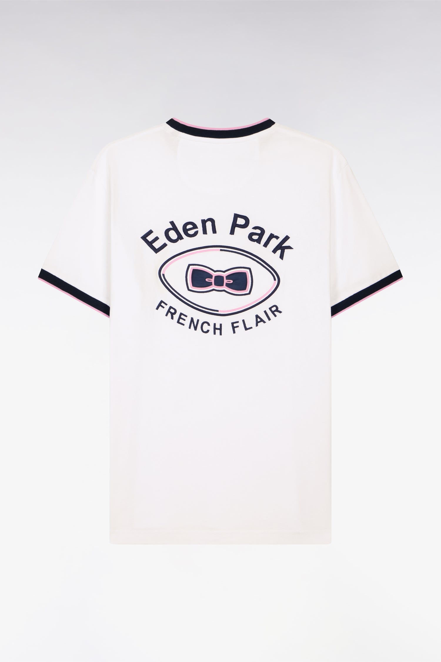 Ce T-shirt original célèbre l'esprit French Flair de la Maison avec ses bordures de col et manches marine à rayure rose et sa broderie nœud papillon sur la poitrine. Au dos, sa broderie exclusive Eden Park dynamise la silhouette tout en affirmant avec fierté l'équipe d'appartenance de ce T-shirt en coton blanc.