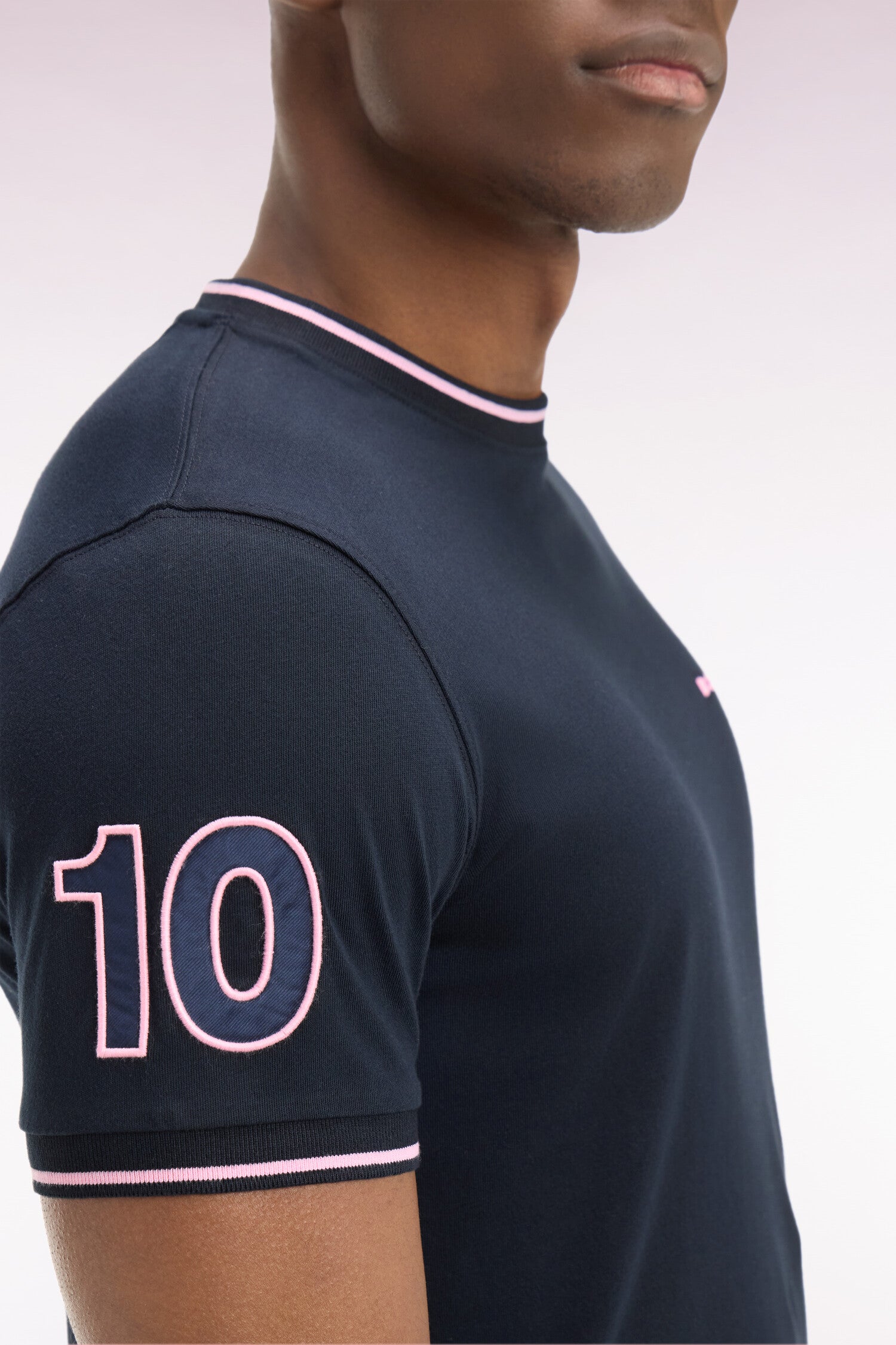 Ce T-shirt homme en jersey de coton revisite un essentiel du vestiaire masculin avec une approche graphique et des codes rugby subtils. Sa coupe droite confortable et ses finitions soignées, broderie 10 hommage au maillot de notre fondateur et bords-côtes rayés, en font une pièce facile à porter au quotidien, idéale pour composer une tenue sport chic décontractée.