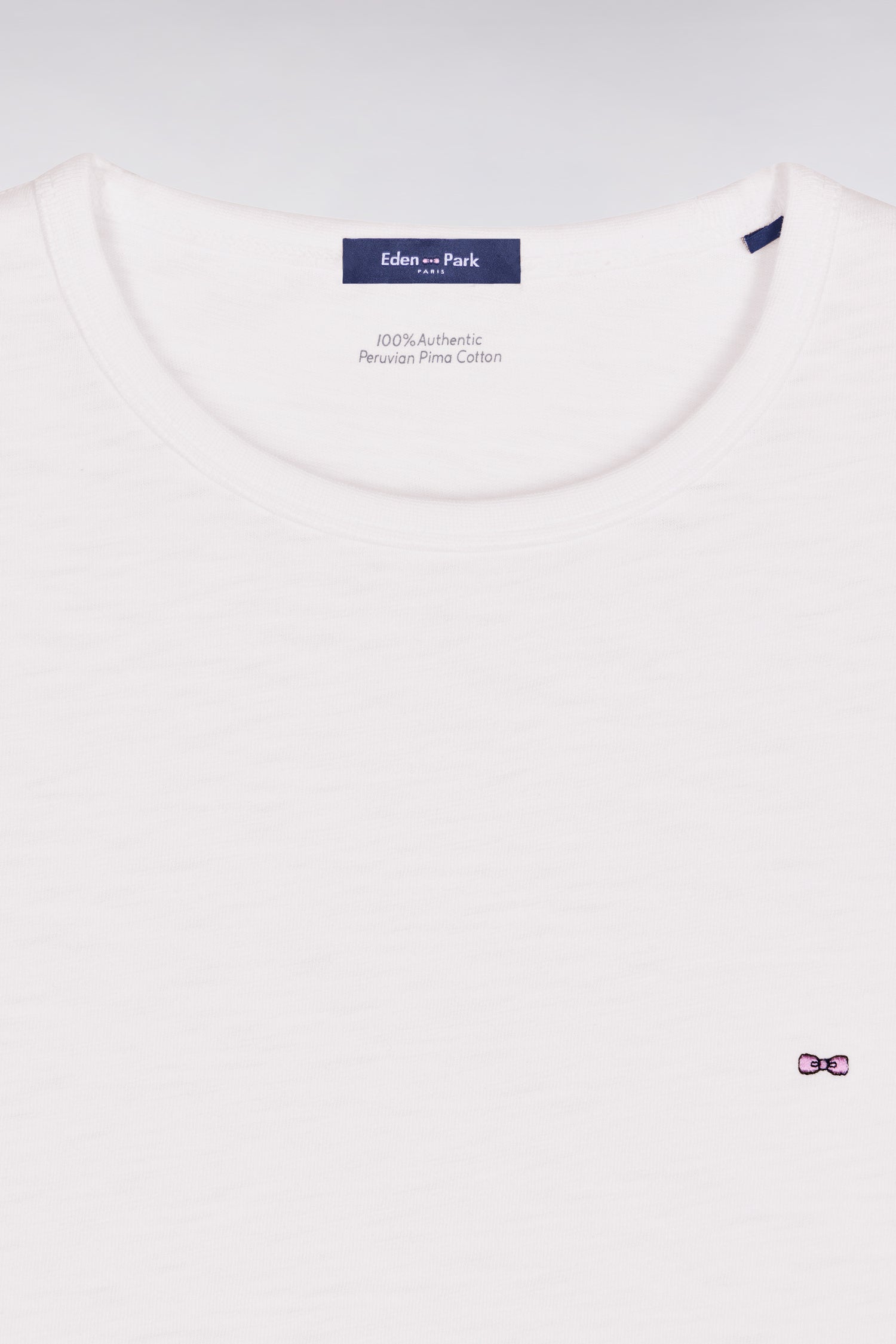 Ce T-shirt droit en jersey de coton slub affirme l'intemporalité et la durabilité de notre vestiaire. Doté d'un col rond seyant il se distingue par sa petite broderie nœud papillon rose, signature discrète et élégante de notre Maison. Ce basique de qualité traversera les saisons avec style. Un vrai pilier pour donner libre cours à votre créativité mode.