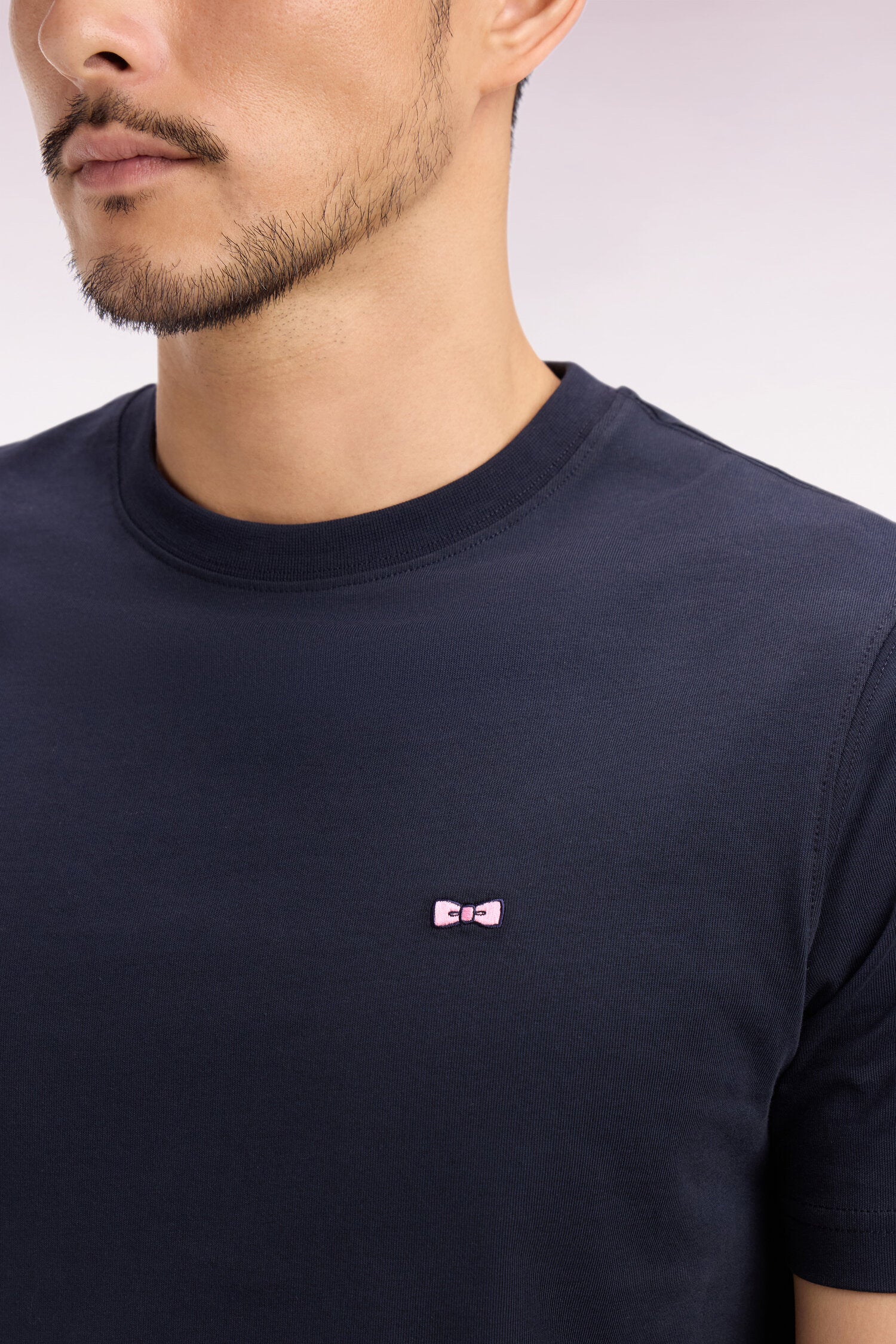 Sobre à l’avant, ce T-shirt homme bleu marine à col rond en bords-côtes dévoile au dos une sérigraphie exclusive s'amusant de notre emblème : le nœud papillon. Ce détail original signe la singularité de cette pièce, tout en conservant une allure équilibrée et facile à porter au quotidien.