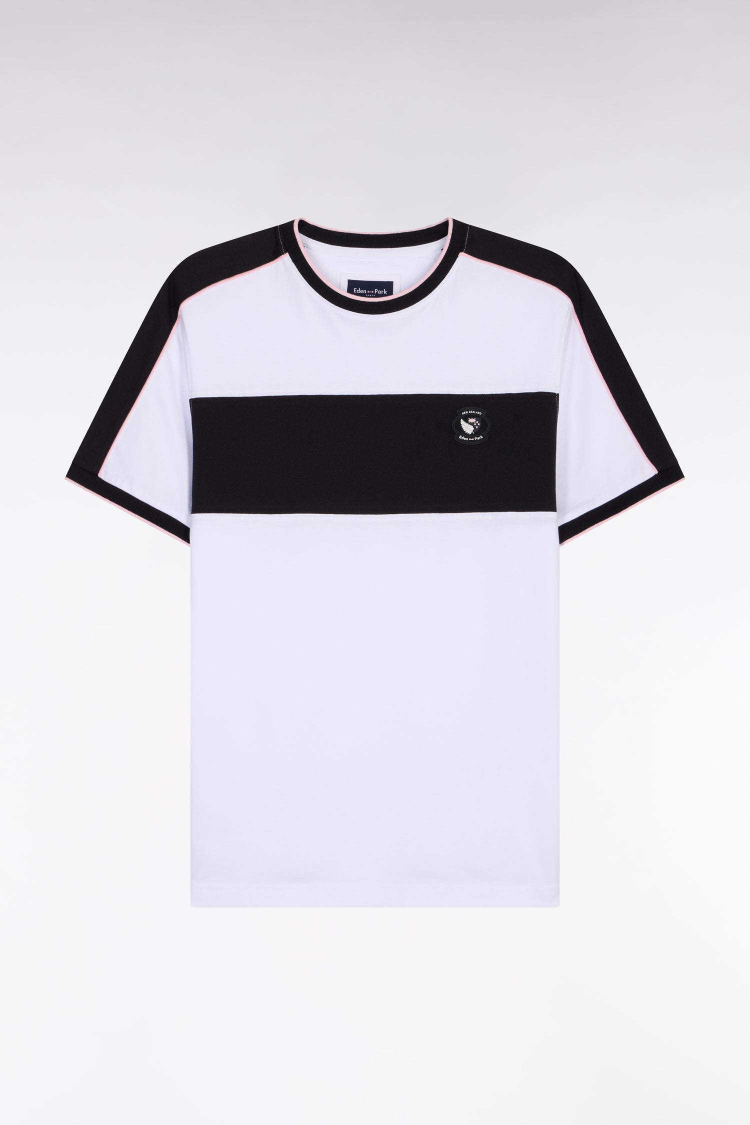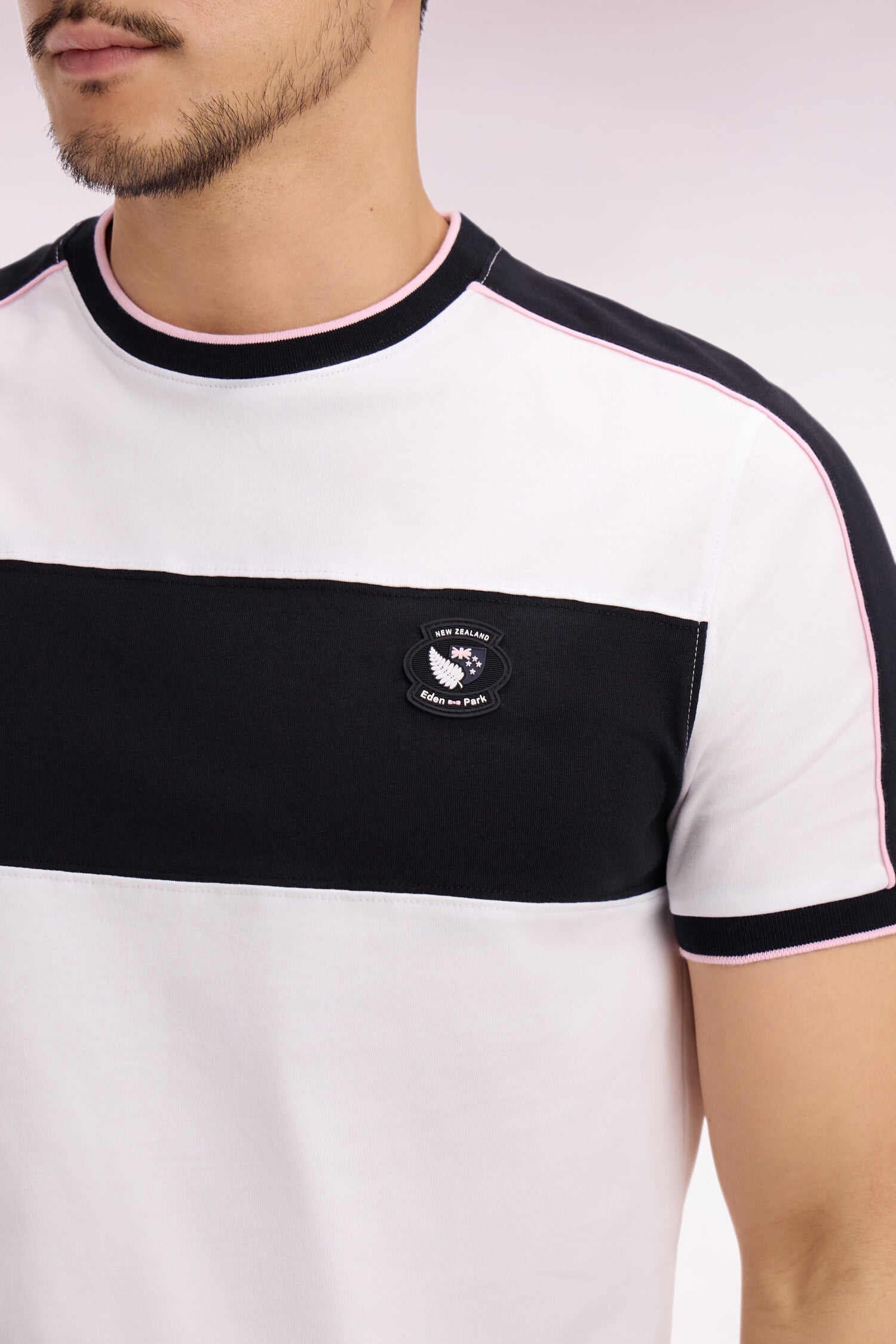 Ce T-shirt homme de notre capsule New Zealand est confectionné en jersey de coton blanc ou noir et se distingue par ses découpes et passepoils contrastés, noirs ou fuchsia selon le coloris choisi, et son badge sur la poitrine. Ses finitions bords-côtes rayées affirment son style sport-chic emblématique de nos créations.