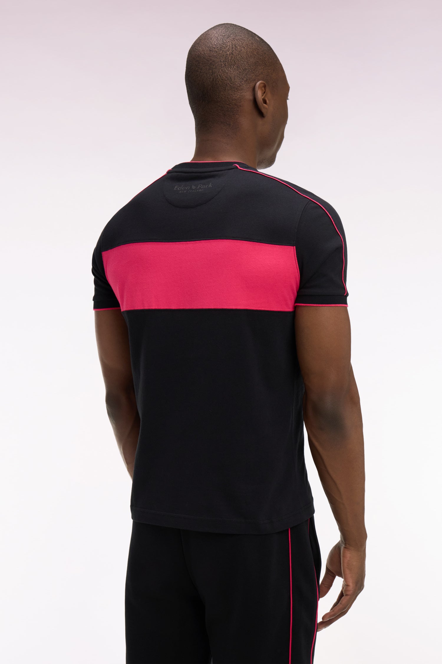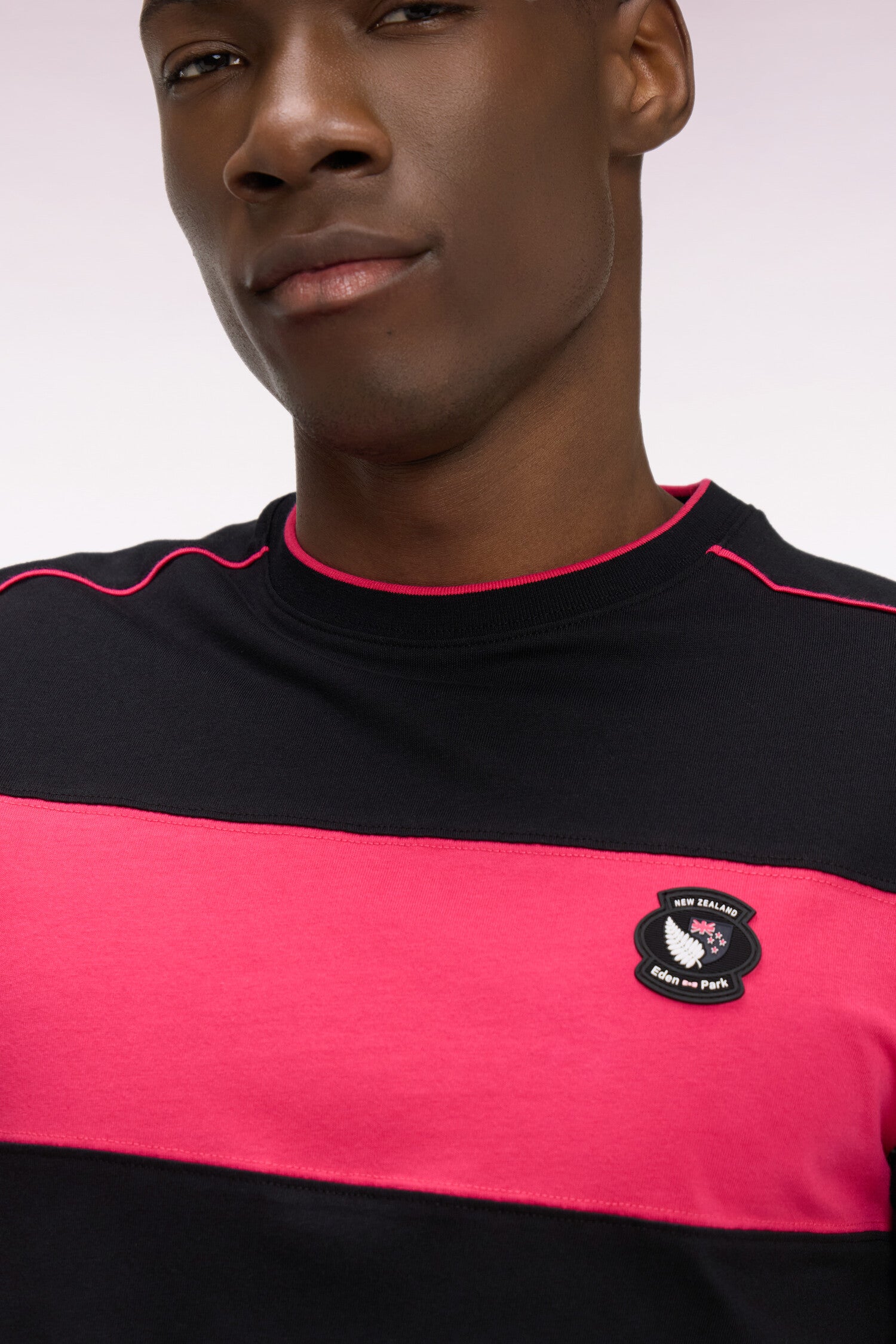 Ce T-shirt homme de notre capsule New Zealand est confectionné en jersey de coton blanc ou noir et se distingue par ses découpes et passepoils contrastés, noirs ou fuchsia selon le coloris choisi, et son badge sur la poitrine. Ses finitions bords-côtes rayées affirment son style sport-chic emblématique de nos créations.