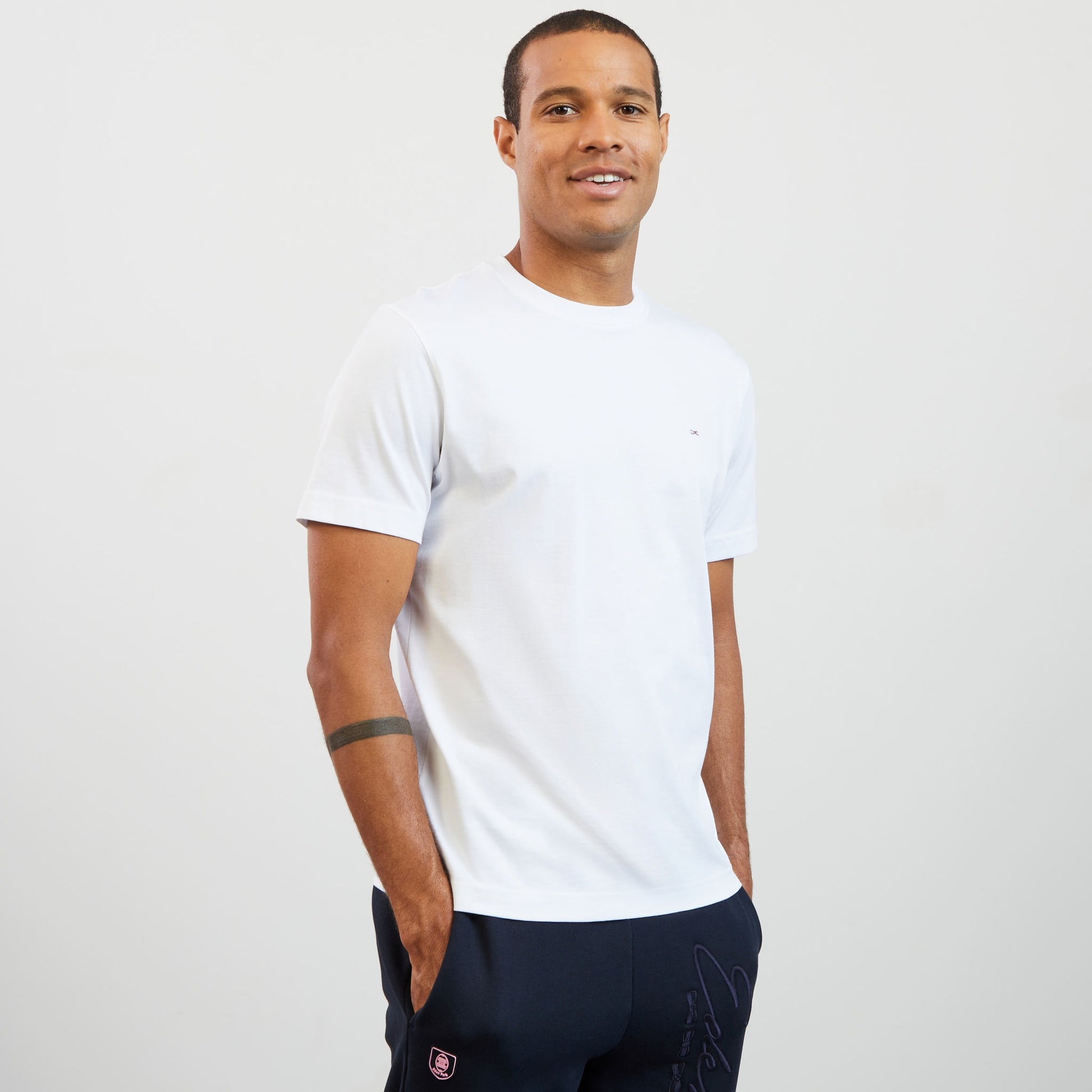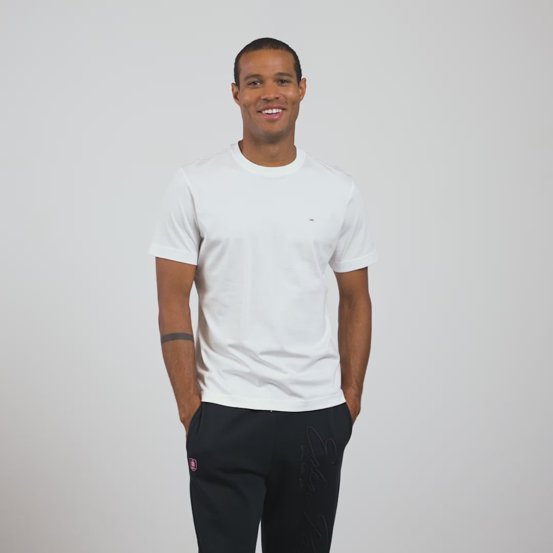 This t-shirt is made from soft, pleasant Pima cotton jersey. Note the embroidered bow tie, large on the back and small on the chest.