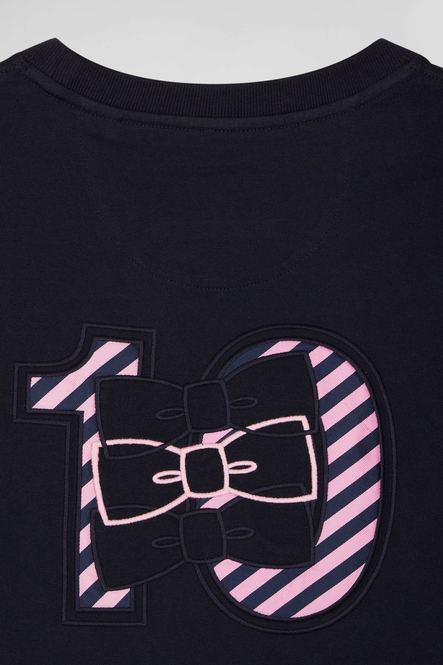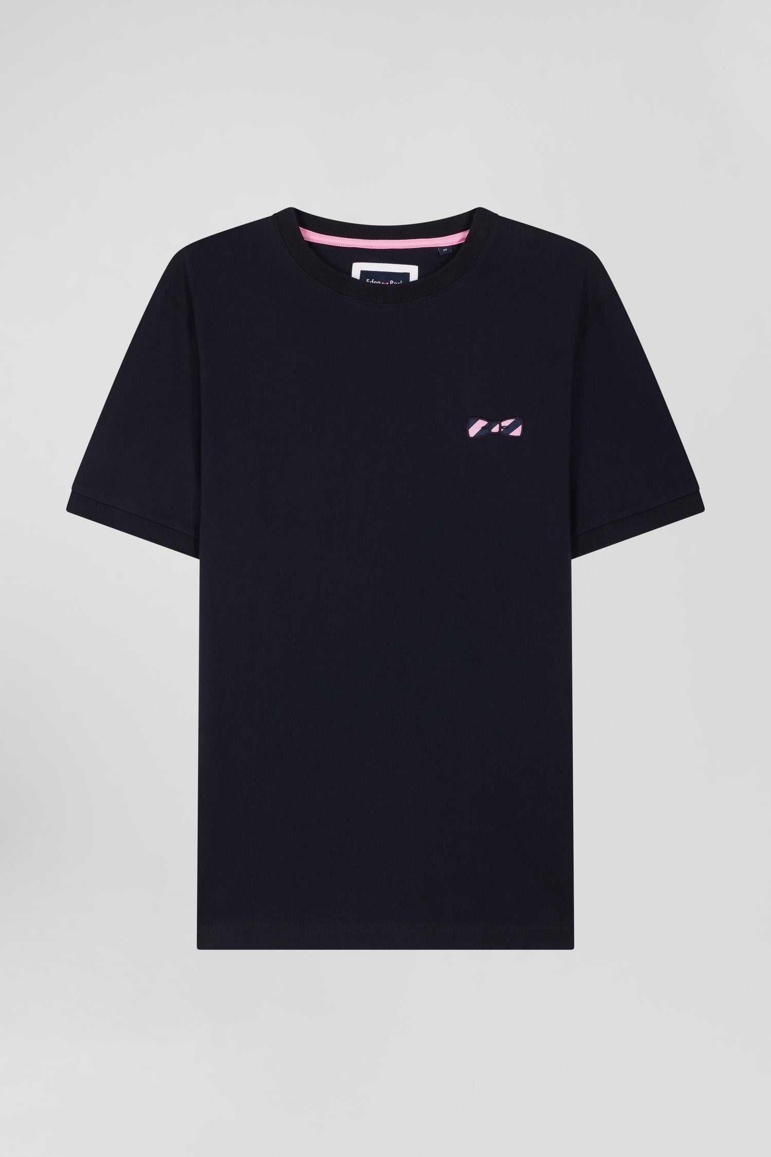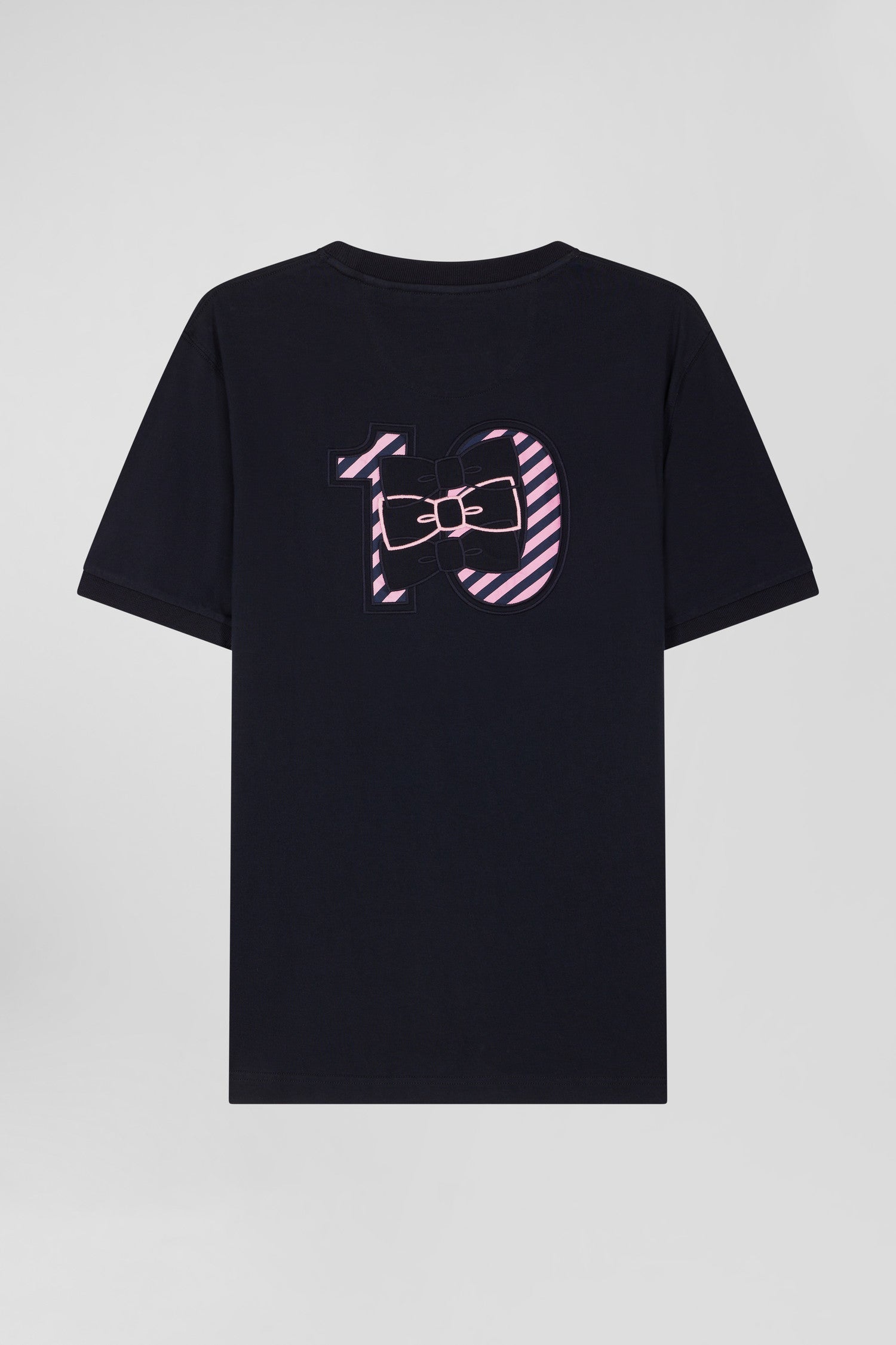 Regular navy short-sleeved cotton T-shirt with striped embroidery