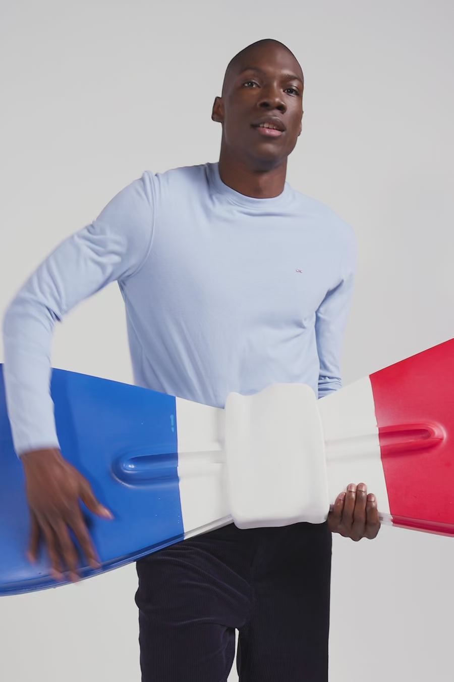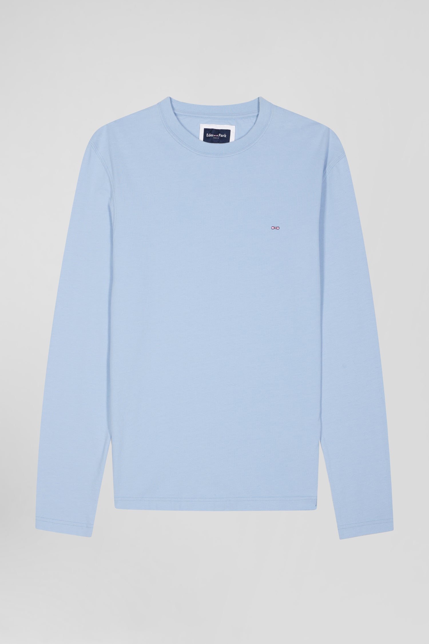 Regular sky blue long-sleeved cotton T-shirt with floral back patch