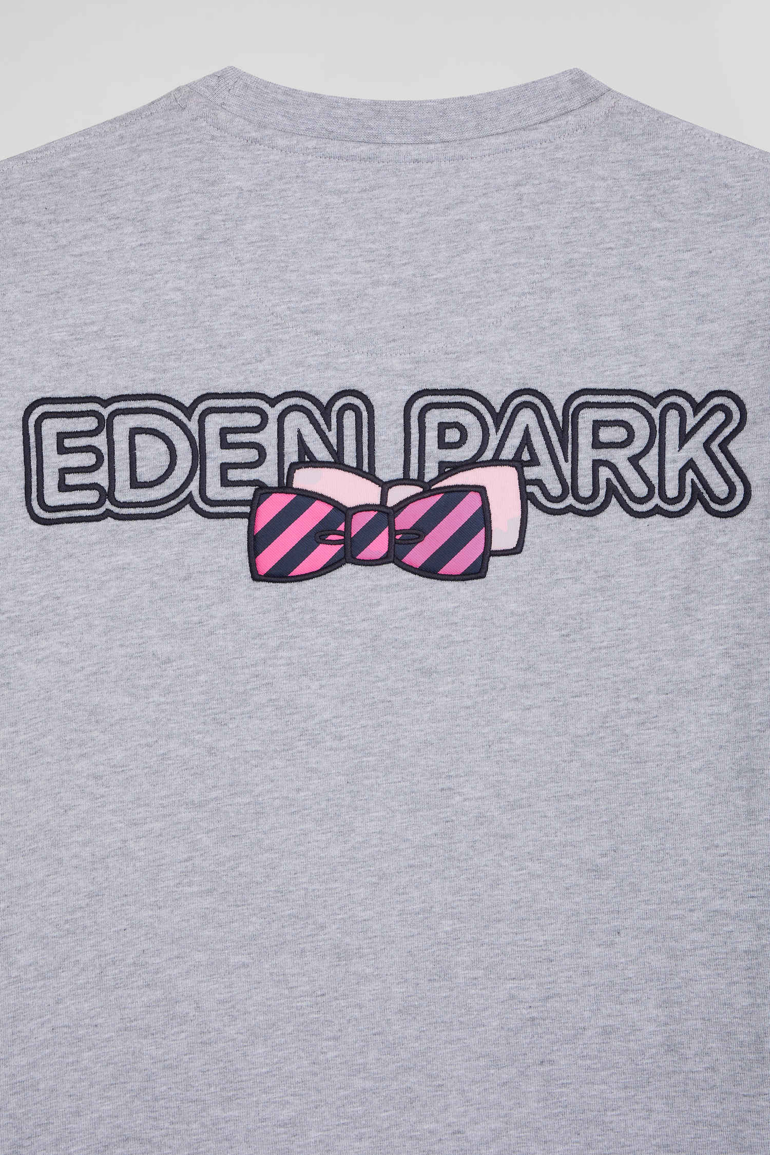 An Eden Park emblem, this long-sleeved T-shirt features back embroidery combined with the application of tie fabric. On the front, a double bowtie embroidery marks this model. Available in gray or navy, this soft cotton jersey T-shirt can be combined with any style statement.