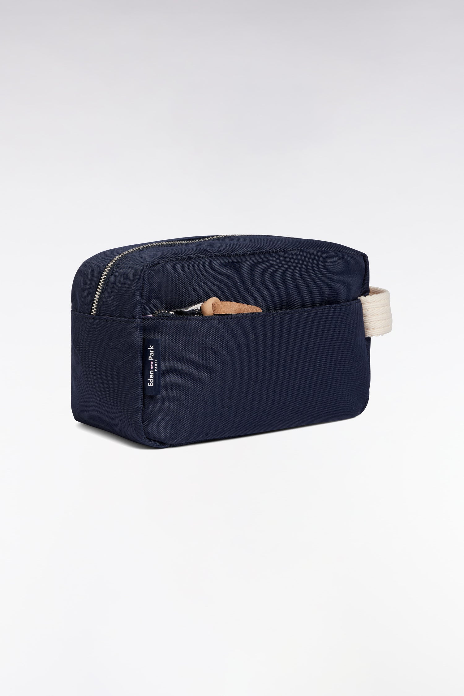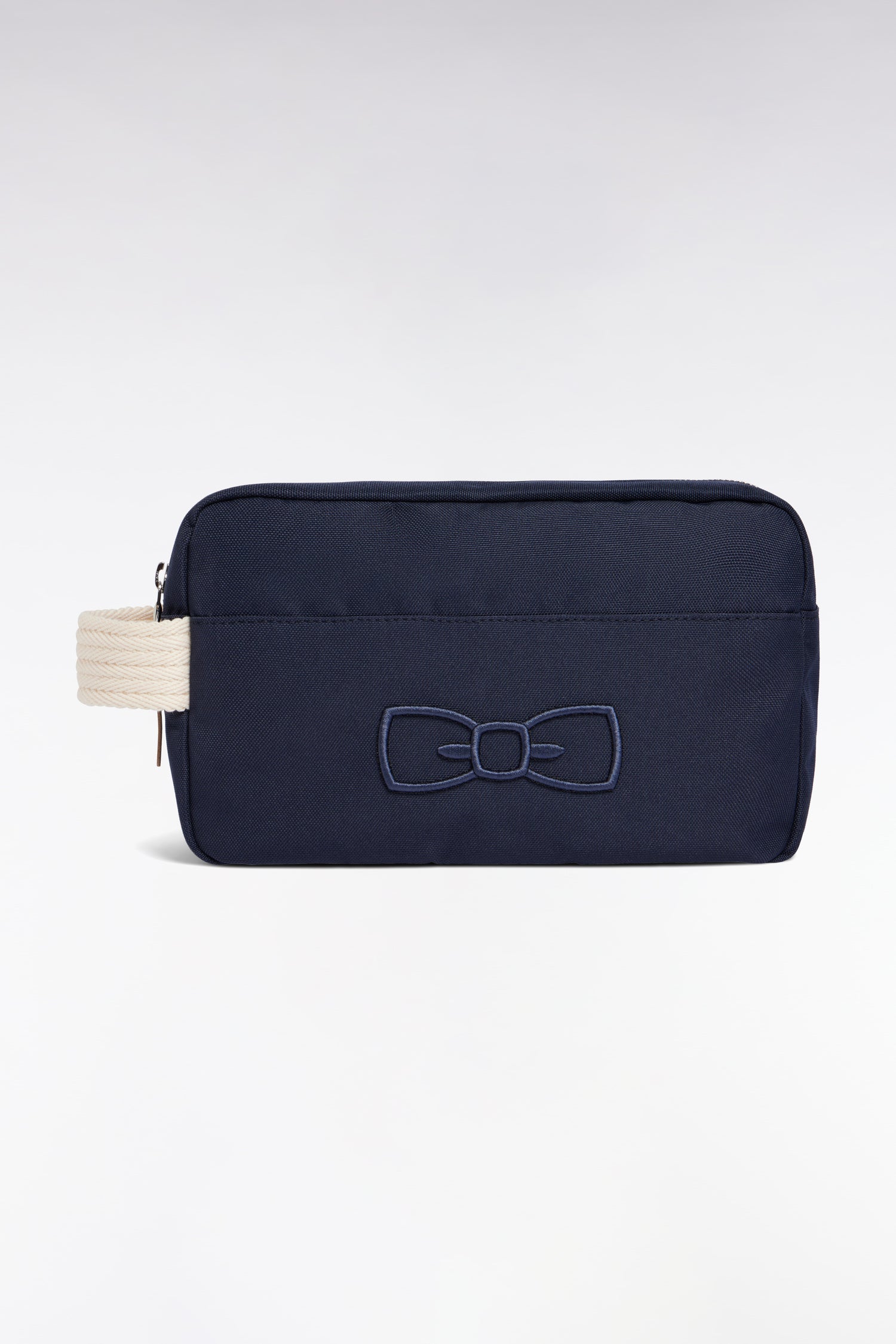 This zipped toiletry bag with its sober, functional design is designed to accompany you wherever you go. Its navy exterior opens onto an interior lined with pink and navy stripes, ideal for organizing your essentials. The tone-on-tone embroidered bow tie discreetly marks this compact accessory, practical for everyday use or travel. On the front, this men's toiletry bag features a zipped pocket.