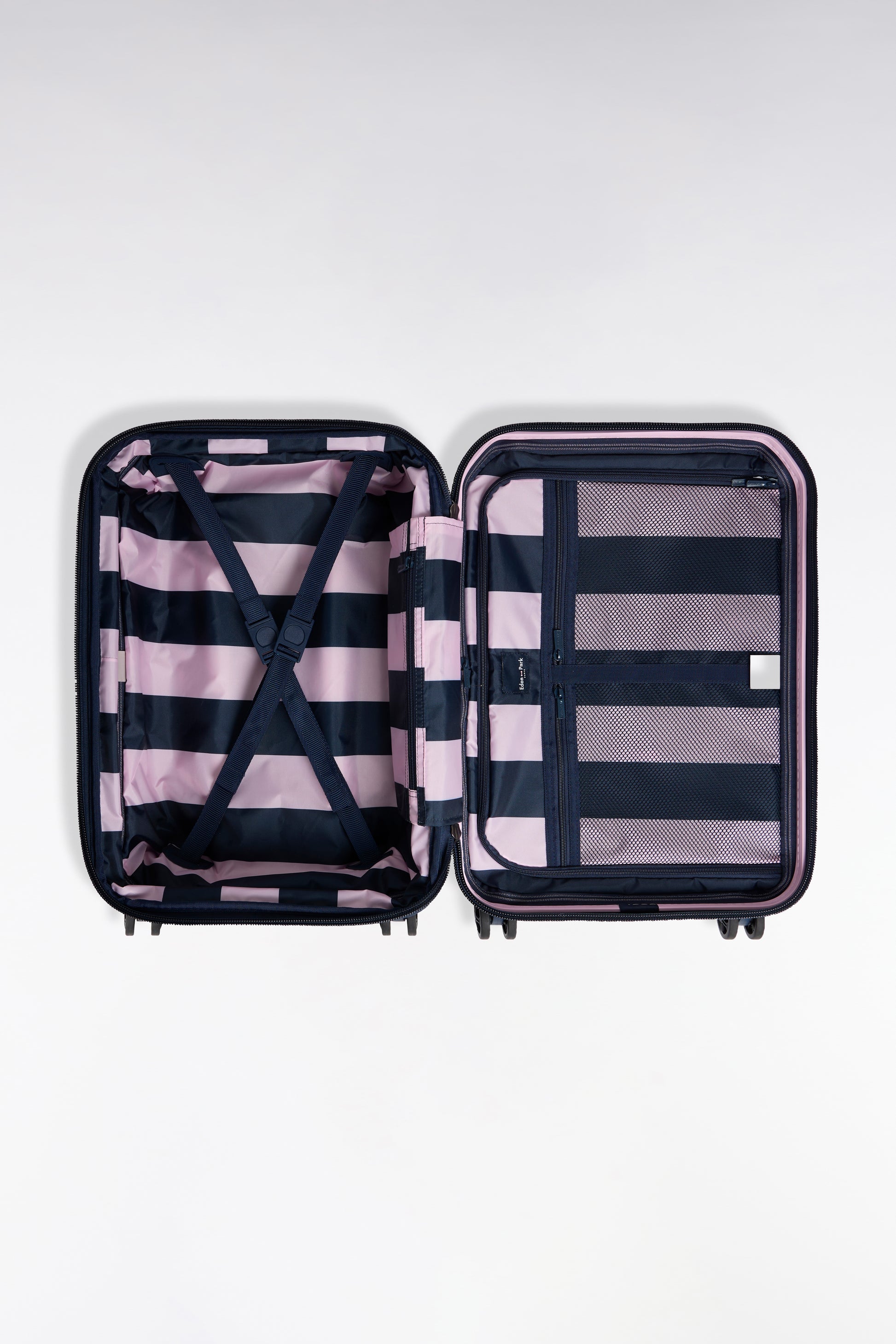 Escape in style with this exclusive cabin suitcase created with the Delsey Paris teams in the colors of Eden Park. The legendary Rempart suitcase, now in the French Flair tour, is distinguished by its navy finish enhanced by powder pink accents and our emblematic bow tie. The French luggage manufacturer's sense of innovation has gone into the design of this expandable cabin suitcase, offering generous storage space in a compact format. Inside, the removable recycled lining features our iconic rugby stripes and is embellished with straps and nets. Equipped with 4 silent multidirectional wheels, a secure closure and a TSA-standard code lock, the French Flair Touré suitcase raises the bar for travel safety and comfort. Weekends, road trips, short stays or business trips: the Tournée French Flair suitcase is an indispensable ally of style. This exclusive model is available in a limited edition at selected points of sale.