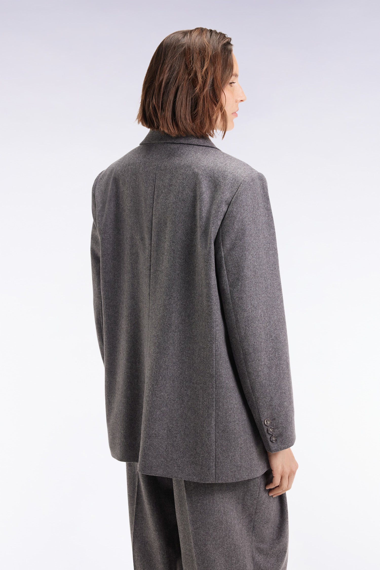Revisiting the codes of the men's wardrobe, this oversized grey flannel blazer combines comfort and contemporary allure. Its flowing, structured cut enhances every silhouette, while its composition of virgin and recycled wool underscores a more responsible design. Inside, a striped lining pays subtle homage to Eden Park's rugby DNA. Thermally bonded, this jacket with notched collar guarantees easy care and everyday elegance. Wear as a total look with matching pants for a twist on the classics.