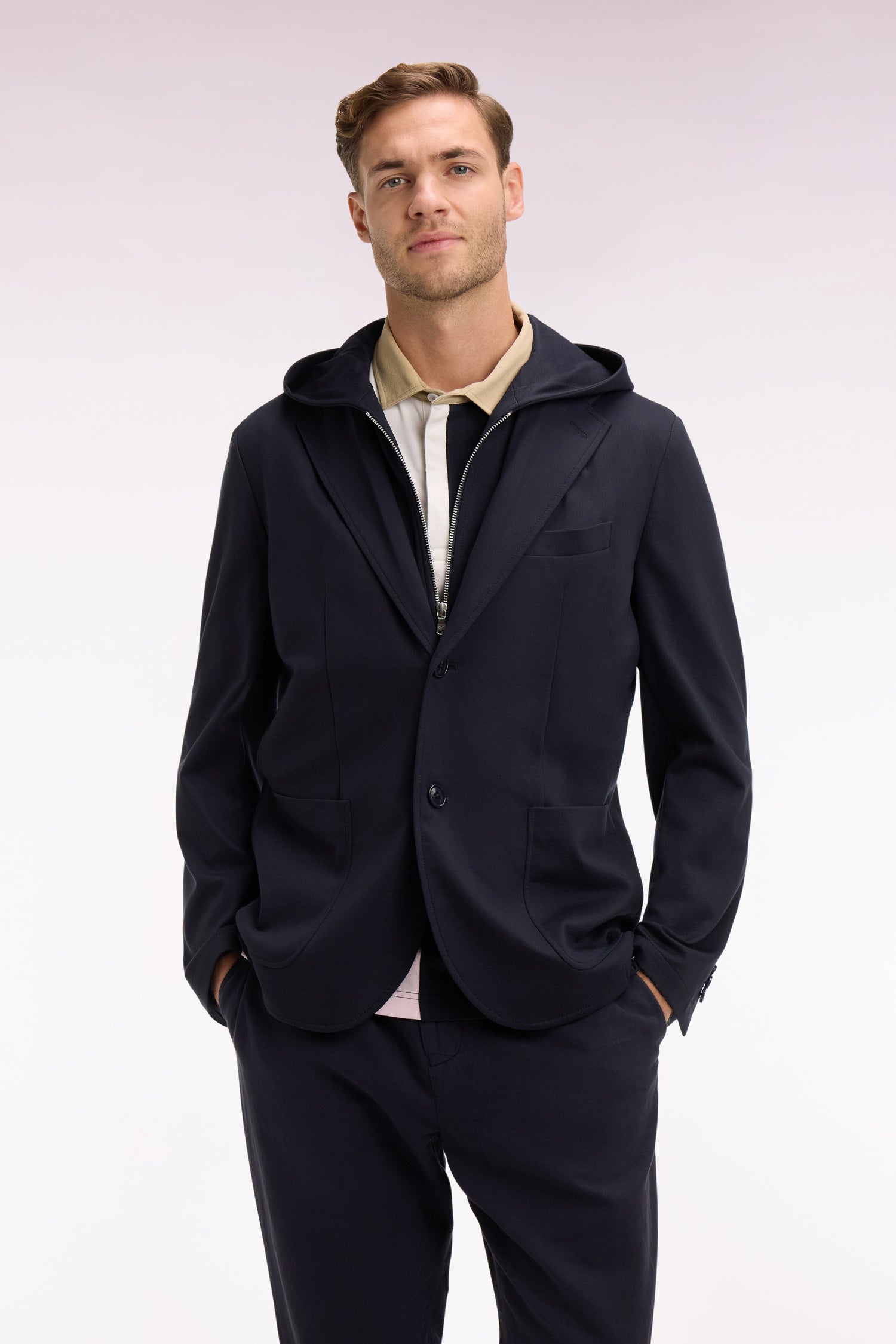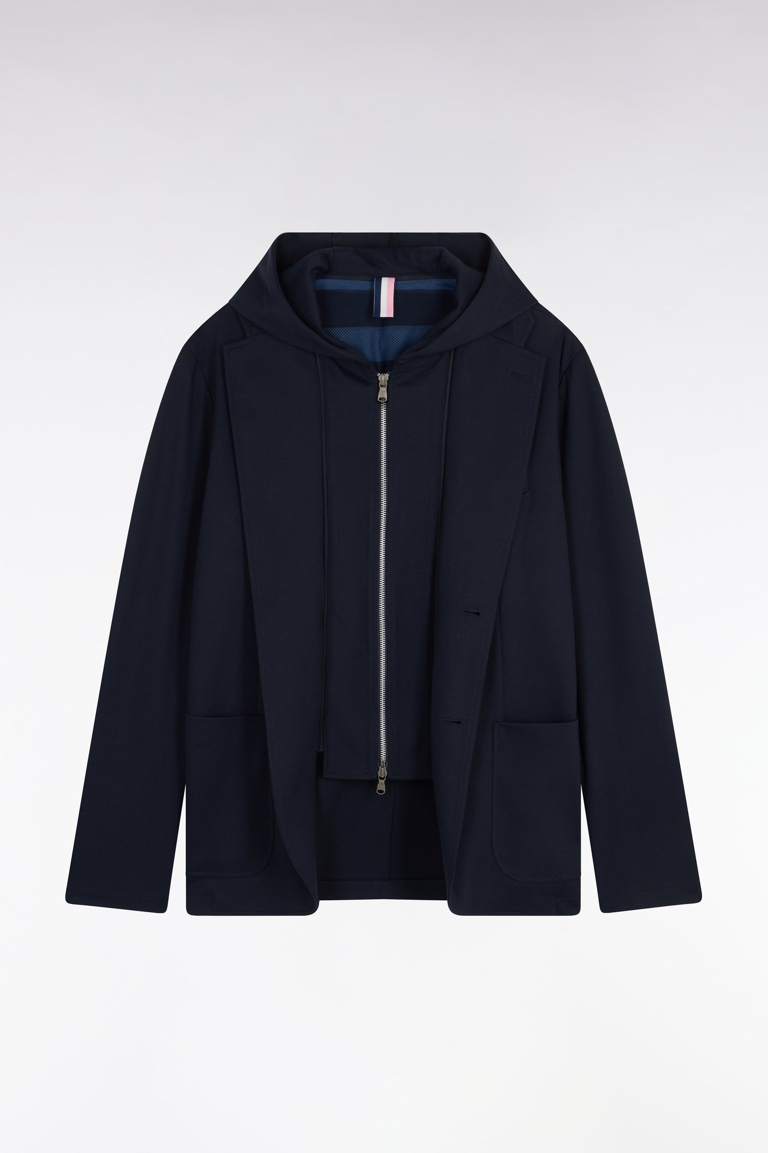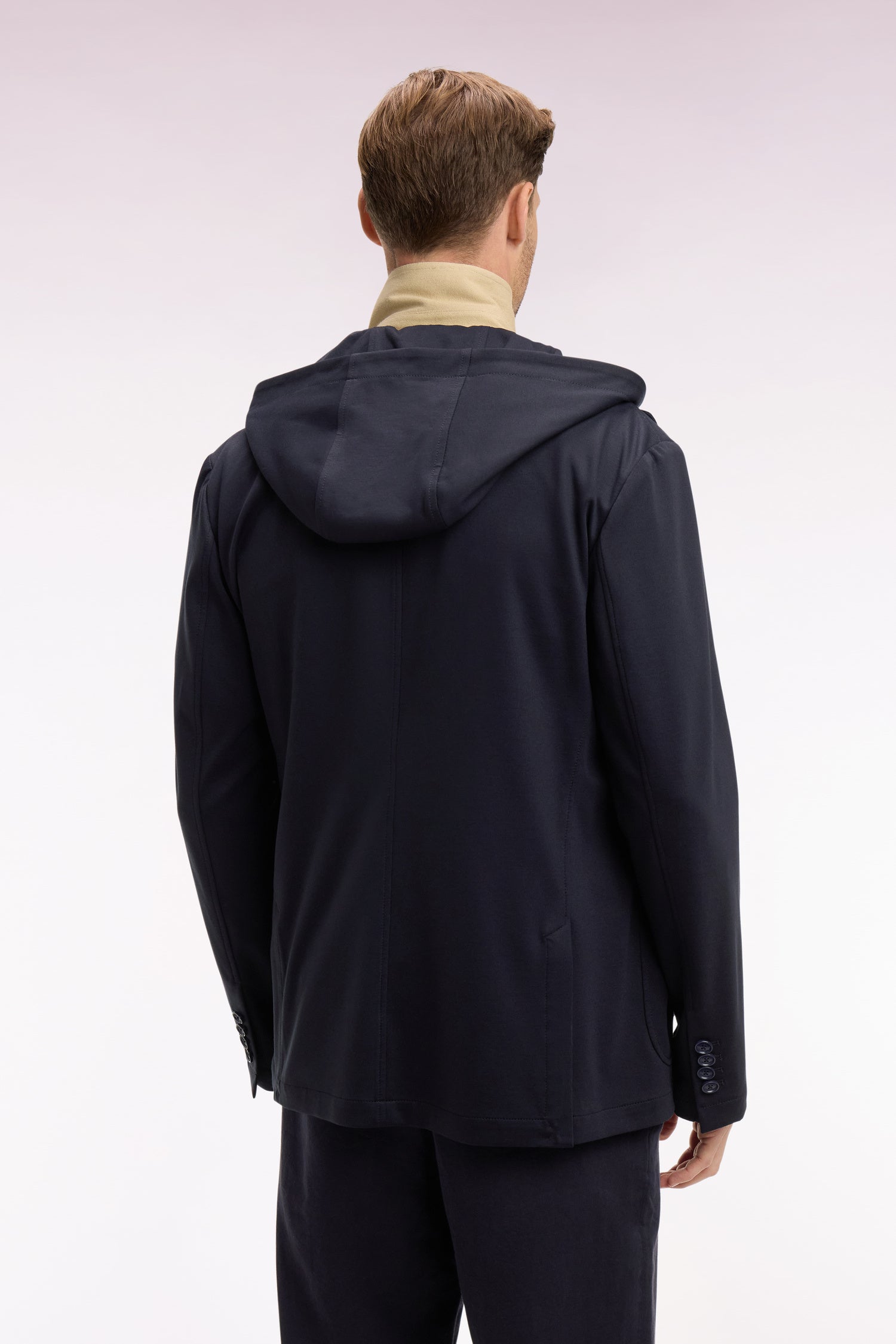 Ce blazer homme en jersey marine conjugue décontraction et élégance urbaine. Confectionné dans un mélange de lyocell à la texture souple et agréable, il séduit par son confort et sa tenue impeccable pensés pour le quotidien. Sa parementure à capuche amovible lui confère une touche moderne et polyvalente, idéale pour passer d’un look citadin à une allure plus habillée ou affronter les éléments. Une pièce signature du vestiaire sport chic, pensée pour accompagner chaque moment avec style.