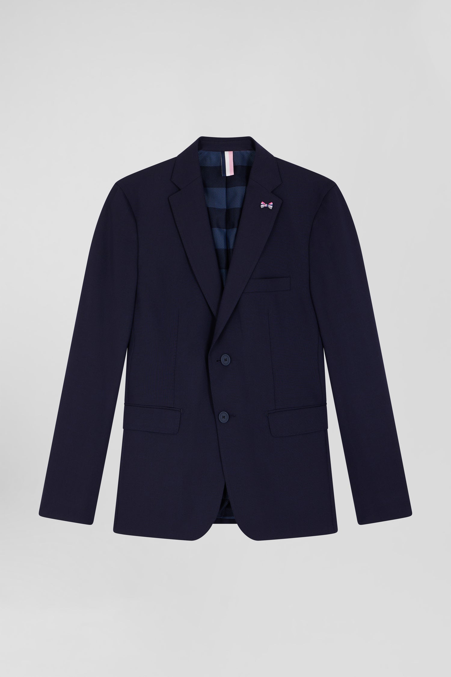 Our wool-blend jacket is available in two elegant colors: navy or mottled gray. This classic model features two buttons, a traditional collar and a slit at the back, offering clean structure and a contemporary touch. Its hooped lining pays homage to rugby jerseys, adding a uniquely sporty dimension to this blazer. Designed for durability and ease of care, this jacket perfectly combines style and practicality, making it an ideal choice for those seeking both elegance and everyday functionality.